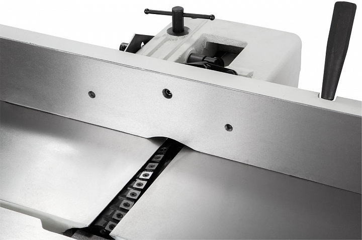 Конструкция образована двумя частями. В нижней, она играет роль тумбы-подставки, однофазный асинхронный мотор и кожух сбора стружки со 100-миллиметровым аспирационным патрубком. В верхней чугунные рабочие столы, защитный кожух, упор заготовки и чугунное основание, где размещен строгальный вал. Оба стола регулируются по высоте при помощи винтовых механизмов, приводимых в действие ручками-маховиками. Перемещением подающего (переднего) стола устанавливают глубину строгания, для чего есть соответствующая разметка; принимающий (задний) регулируют только во время обслуживания при наладочных операциях.