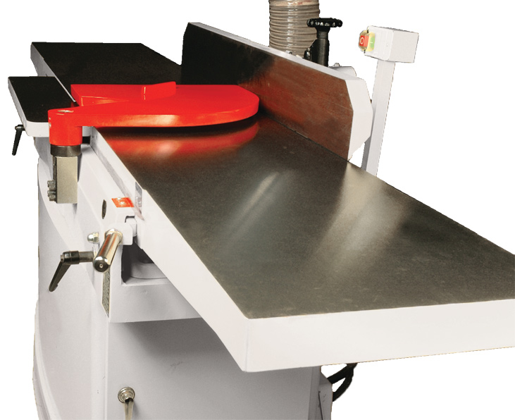 При переходе с одного вала на другой, при замене ножей и в других случаях может потребоваться корректировка положения принимающего стола, такая возможность предусмотрена конструкцией. Есть отдельный стол сбоку от основного, предназначенный для выборки четверти глубиной до 19 мм. Регулируемый по наклону и вылету массивный фуговальный упор с простой регулировкой ограничителя угла установки, удобное поворотное ограждение строгального вала, 140-миллиметровый вытяжной штуцер – все эти особенности также характеризуют Jet PJ-1696 как производительный профессиональный станок, подходящий для промышленного применения.