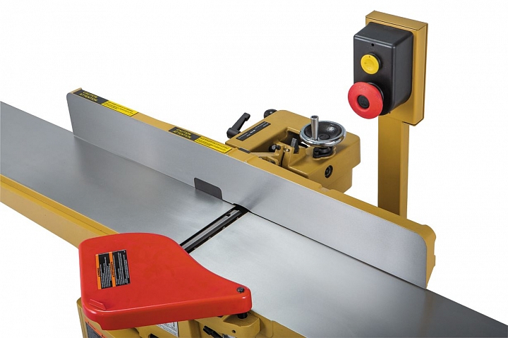 Столы установлены в пазах типа «ласточкин хвост» и имеют регулировку по высоте. Приемный перенастраивают в зависимости от типа строгального вала (helical или стандартный 3-ножевой). Положением подающего задают глубину строгания, регулировка сделана двухступенчатой. Основной эксцентриковый механизм оборудован рычагом и предназначен для быстрого изменения высоты в широких пределах. Вспомогательный (для тонкой настройки) винтовой – вращая набалдашник рычага, производят подстройку в небольшом диапазоне. Массивный чугунный упор заготовки оборудован механическим узлом регулировки. Угол наклона меняют вращением маховика с ручкой. Привод осуществляется через червячную передачу.