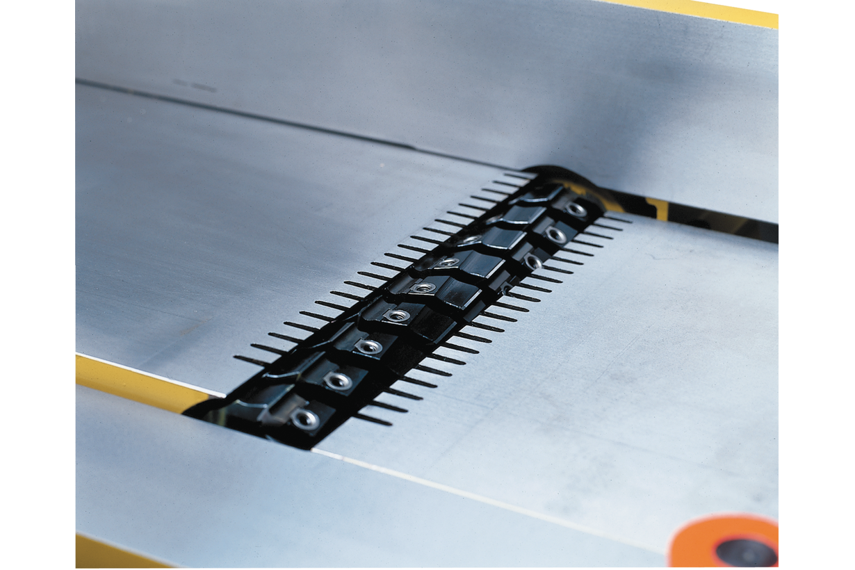 Данная модификация штатно укомплектована ножевым валом helical, который превосходит классический по всем параметрам: 57 твердосплавных лезвий размером 30х12 мм расположены в несколько рядов по спирали, благодаря чему заходят в древесину последовательно и под углом. Это обеспечивает чистое срезание сучков и отсутствие вырывов. У каждого лезвия две режущие грани, что вдвое увеличивает ресурс. Поскольку режущие сегменты установлены жёстко, их уровень относительно приемного стола регулируется изменением положения последнего, такая возможность предусмотрена конструкцией и реализована в виде простых и удобных регулировок обычными рукоятками.