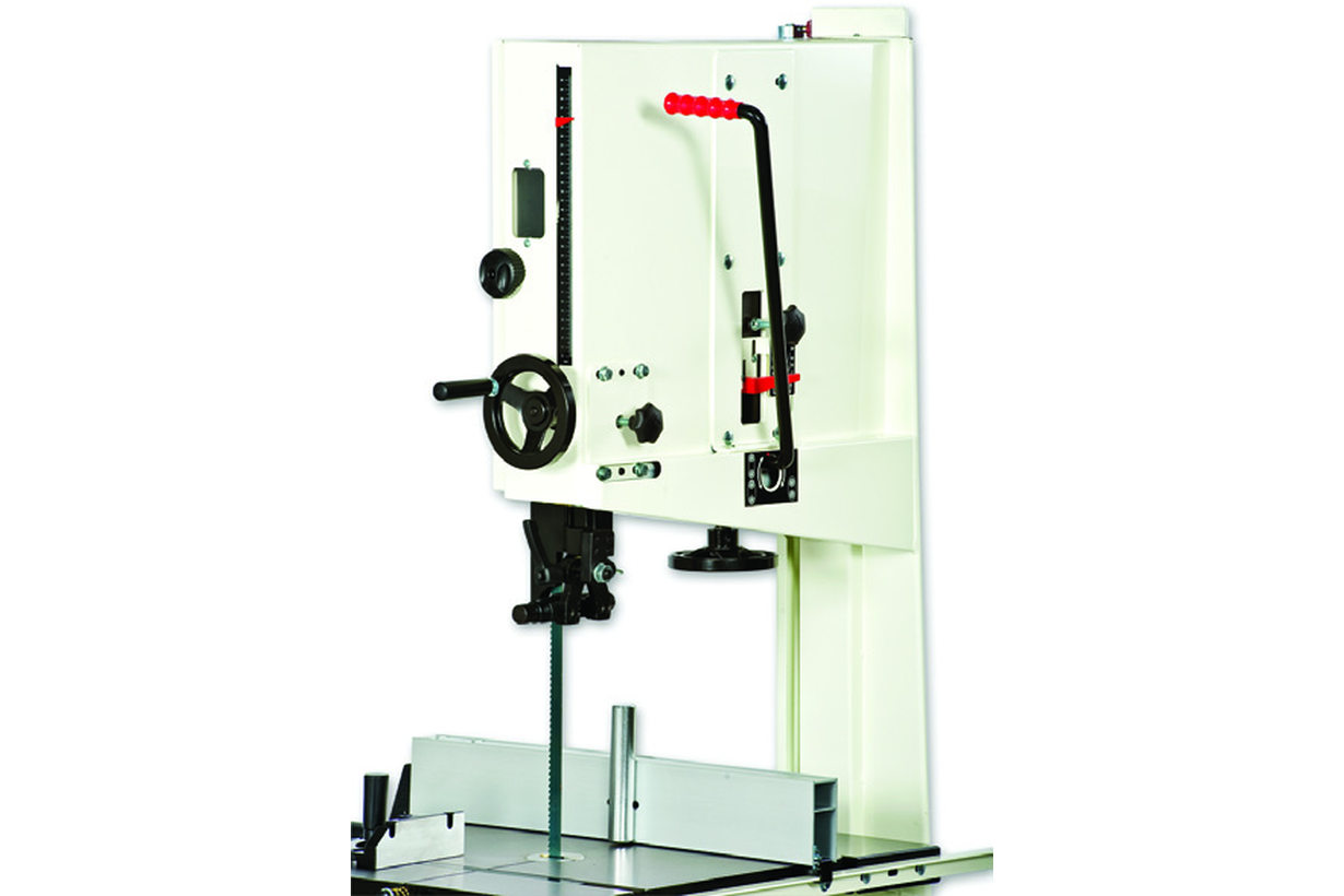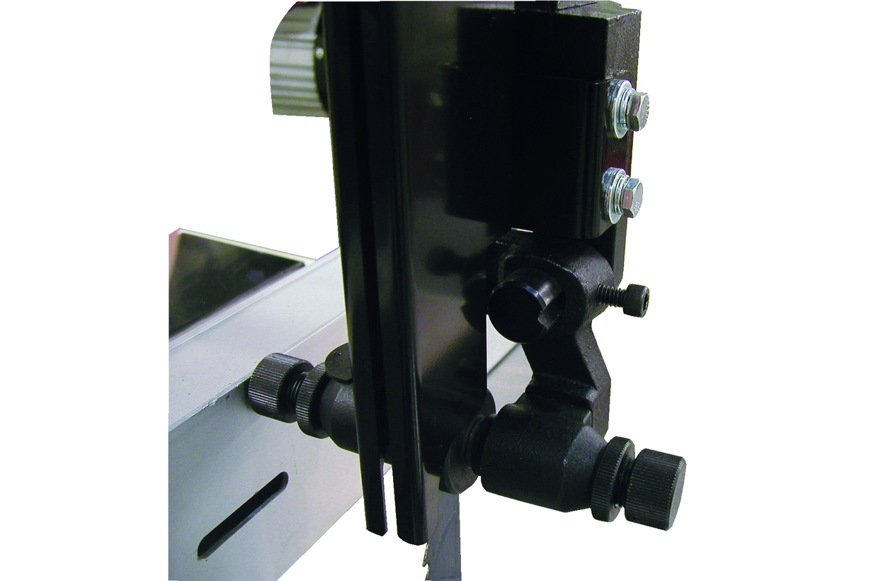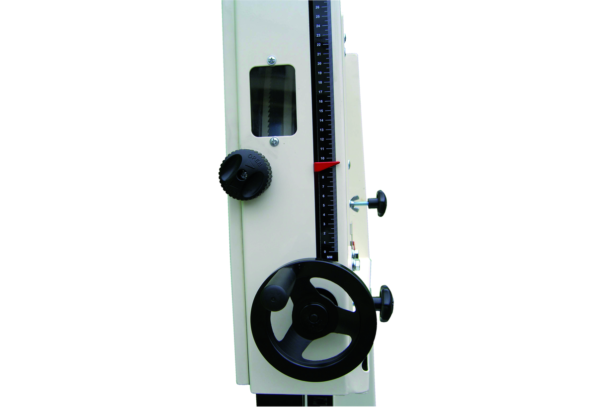 В отличие от многих аналогов пила оборудована трёступенчатой системой натяжения ленты: специальный рычаг позволяет выбрать рабочий режим, режим хранения (шкивы сведены частично) и сервисный для замены полотна (максимальное сближение). Для стабилизации использована система направляющих с «пятаками» для поперечной поддержки и с роликом для продольной. Узел перемещается с помощью реечного механизма регулировки вертикального просвета.