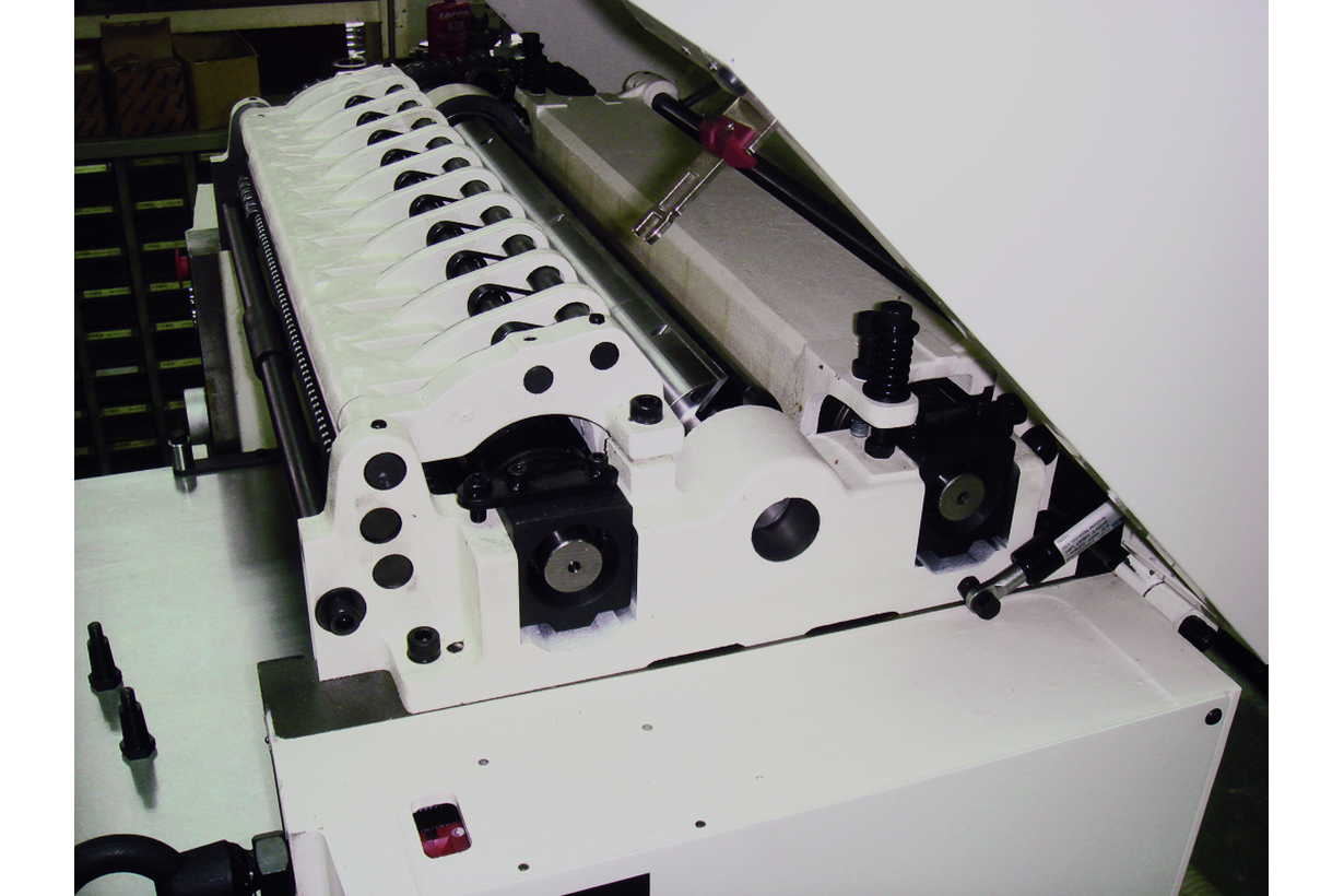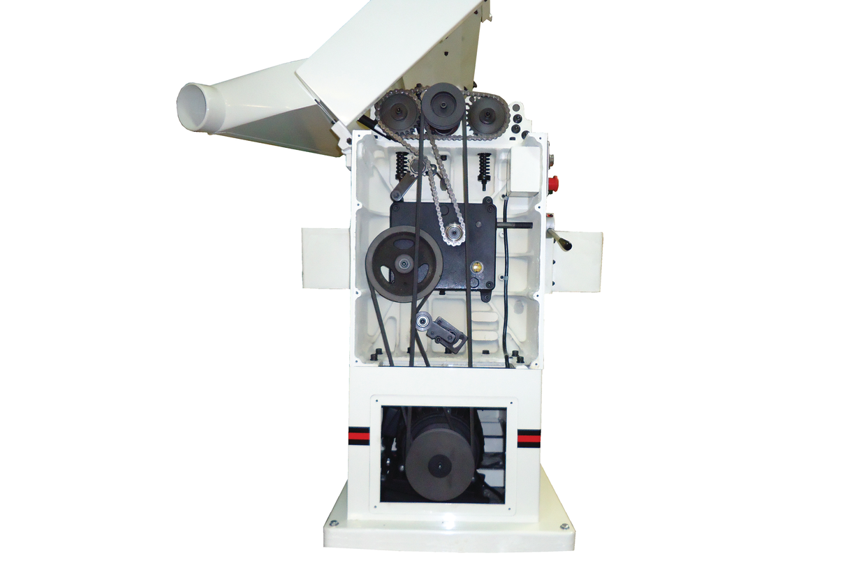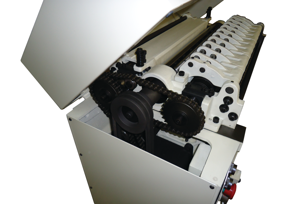 Основные настройки станка реализованы понятно и удобно, что немаловажно в условиях эксплуатации пользователями с разной квалификацией. Высота стола настраивается вращением маховика, на его же оси есть ручка зажима для фиксации установленного значения, прямо перед глазами — шкала с миллиметровыми делениями. Для настройки выступа вальцов, встроенных в стол, предусмотрен удобный рычаг, поворачивающий эксцентрики. Такой механизм обеспечивает простоту, точность и оперативность регулировки, позволяя внести коррективы прямо в процессе работы. Смена скорости подачи производится рычагом с лицевой стороны.