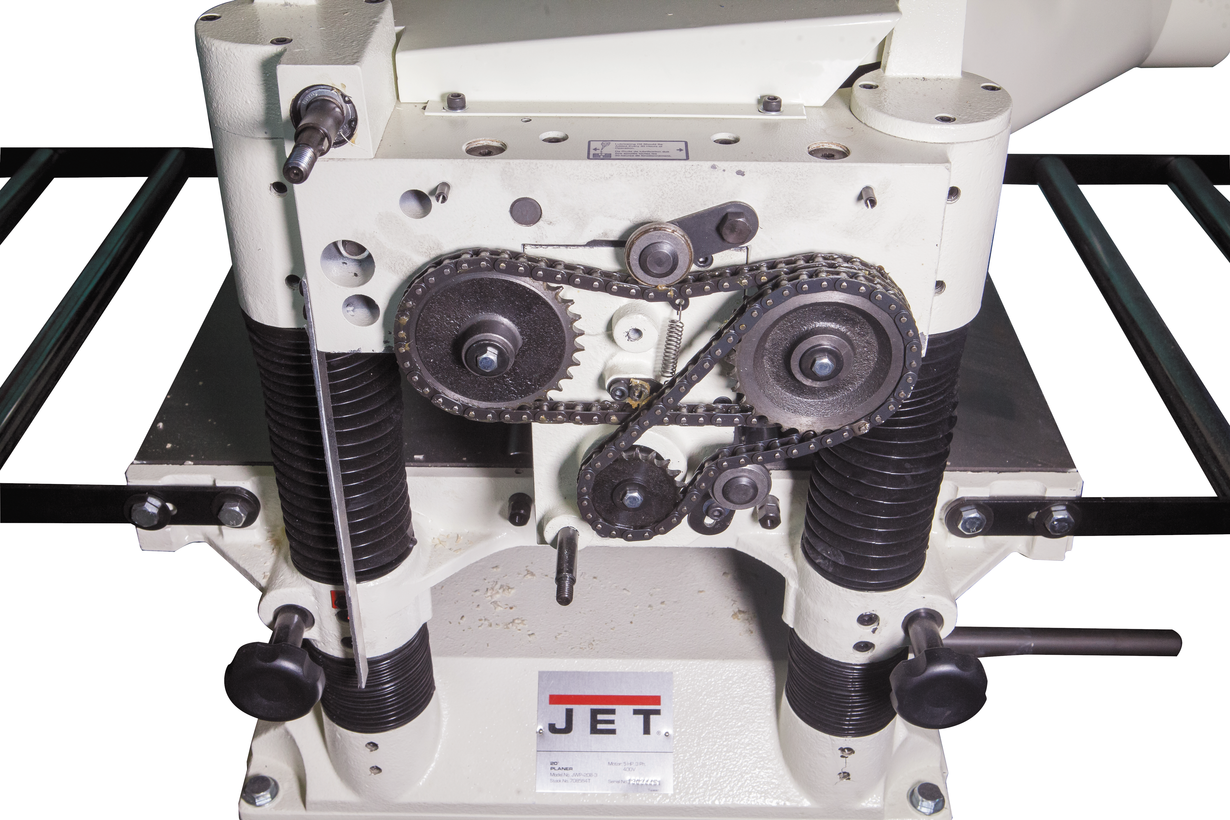 Jet JWP-208-3 — мощный и производительный рейсмусовый станок профессионального класса для частных мастерских с большими объёмами работ и для поточного производства на промышленных предприятиях. Массивная (300 кг), устойчивая и жёсткая конструкция имеет стандартную для среднеразмерных станков компоновку: строгальный узел с мотором и механизмом подачи закреплён неподвижно. Для регулировки просвета и, соответственно, толщины снимаемого слоя стол перемещается по четырём колоннам. «Лифт» производится вращением маховика с рукояткой, после регулировки положение стопорится винтовыми зажимами. С верхней стороны моторного модуля есть вальцы для обратной подачи заготовки. Ролики в поверхности стола, снижающие трение заготовки, установлены на эксцентриковых осях для простой и удобной регулировки выступа над его уровнем.