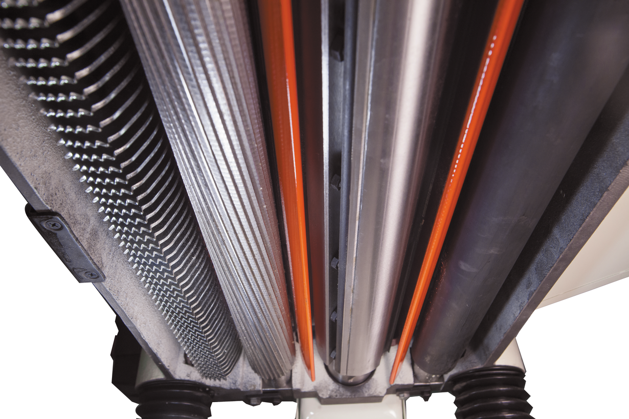Подача заготовки производится валами разного типа: первый металлический с насечками («рябуха»), второй гладкий резиновый. Механизм привода с двумя передачами для выбора скорости (7 или 10 м/мин).