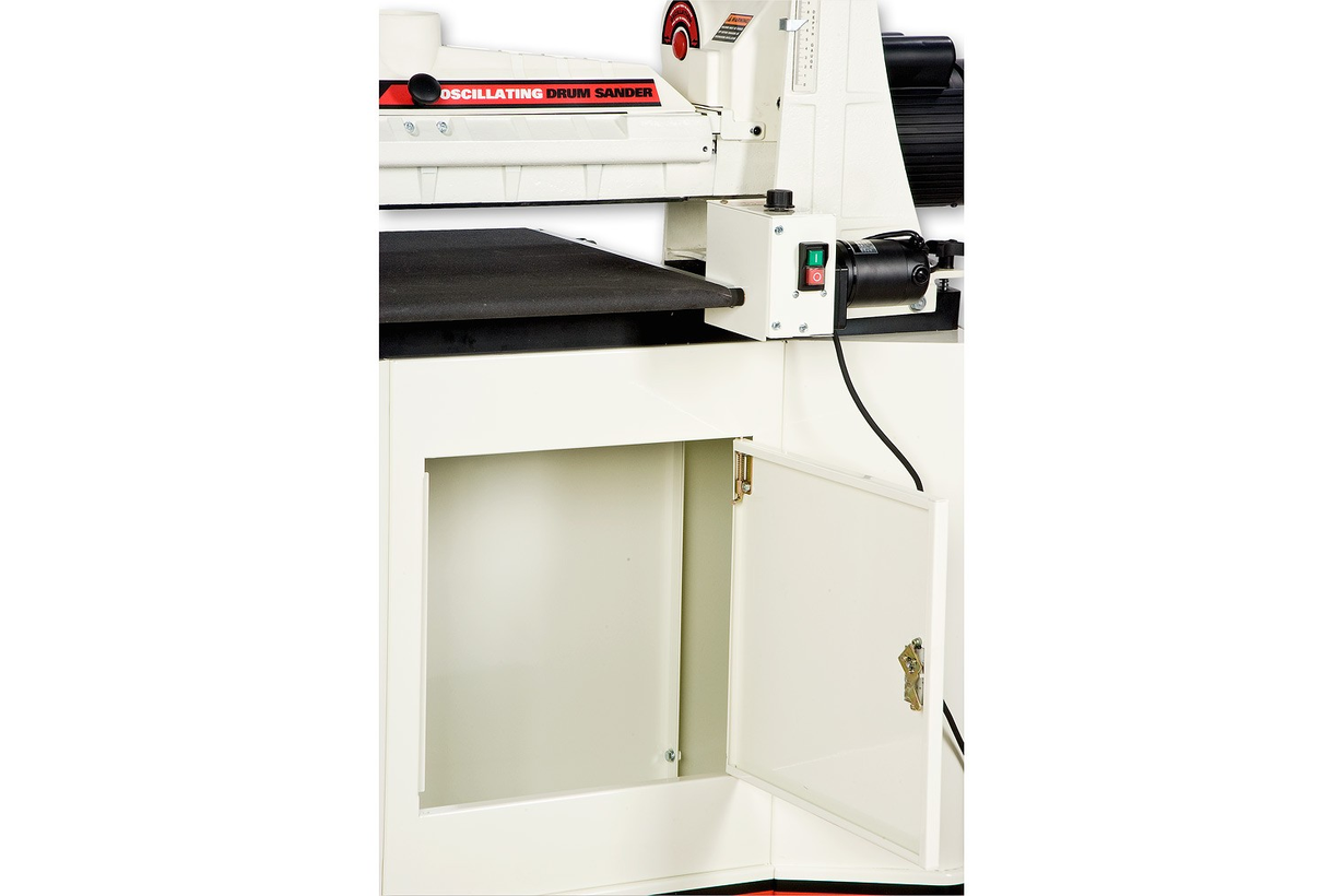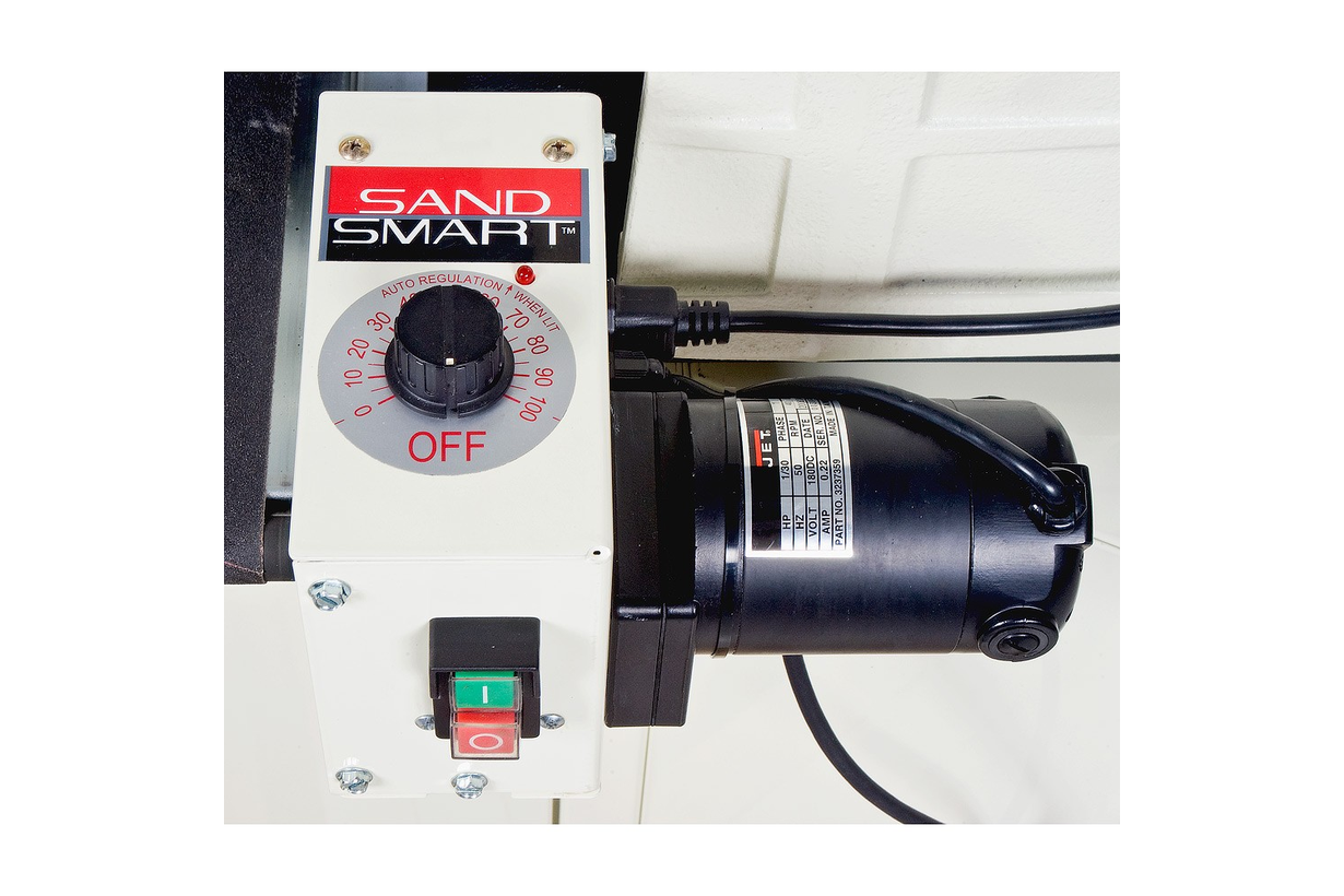 Jet 22-44 OSC осциллирующий барабанно-шлифовальный станок с автоматической подачей заготовки на транспортерной ленте. Основное назначение – шлифование и калибрование изделий из древесины. Модель поставляется в комплекте с тумбой-подставкой, оборудованной колесами и тормозом. Жёсткая конструкция с чугунными основанием и кронштейном крепления консоли обеспечивает высокую точность и повторяемость, что особенно важно в условиях поточного производства. Поскольку вал закреплен с одной стороны, можно шлифовать широкие детали в два прохода с поворотом. При работе с длинными заготовками желательно установить удлинения загрузочно-разгрузочного стола (арт.982202).