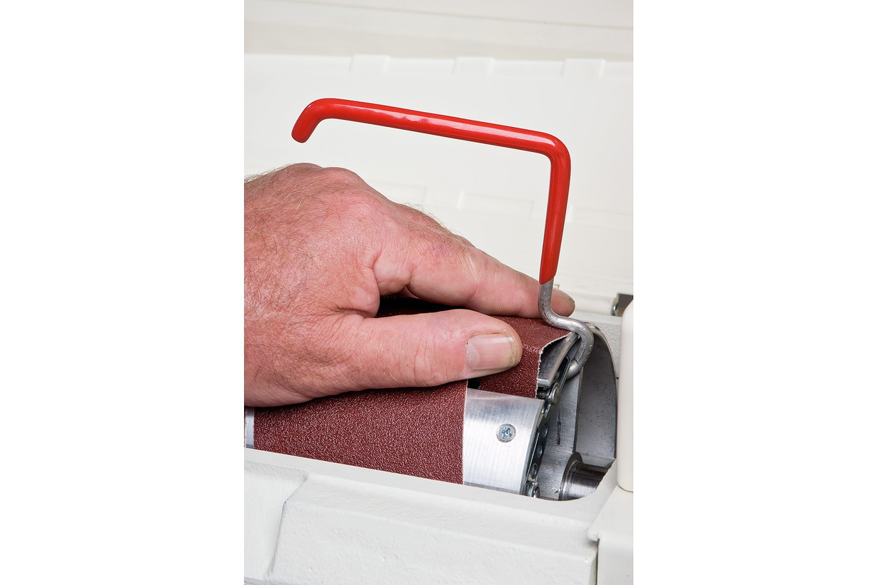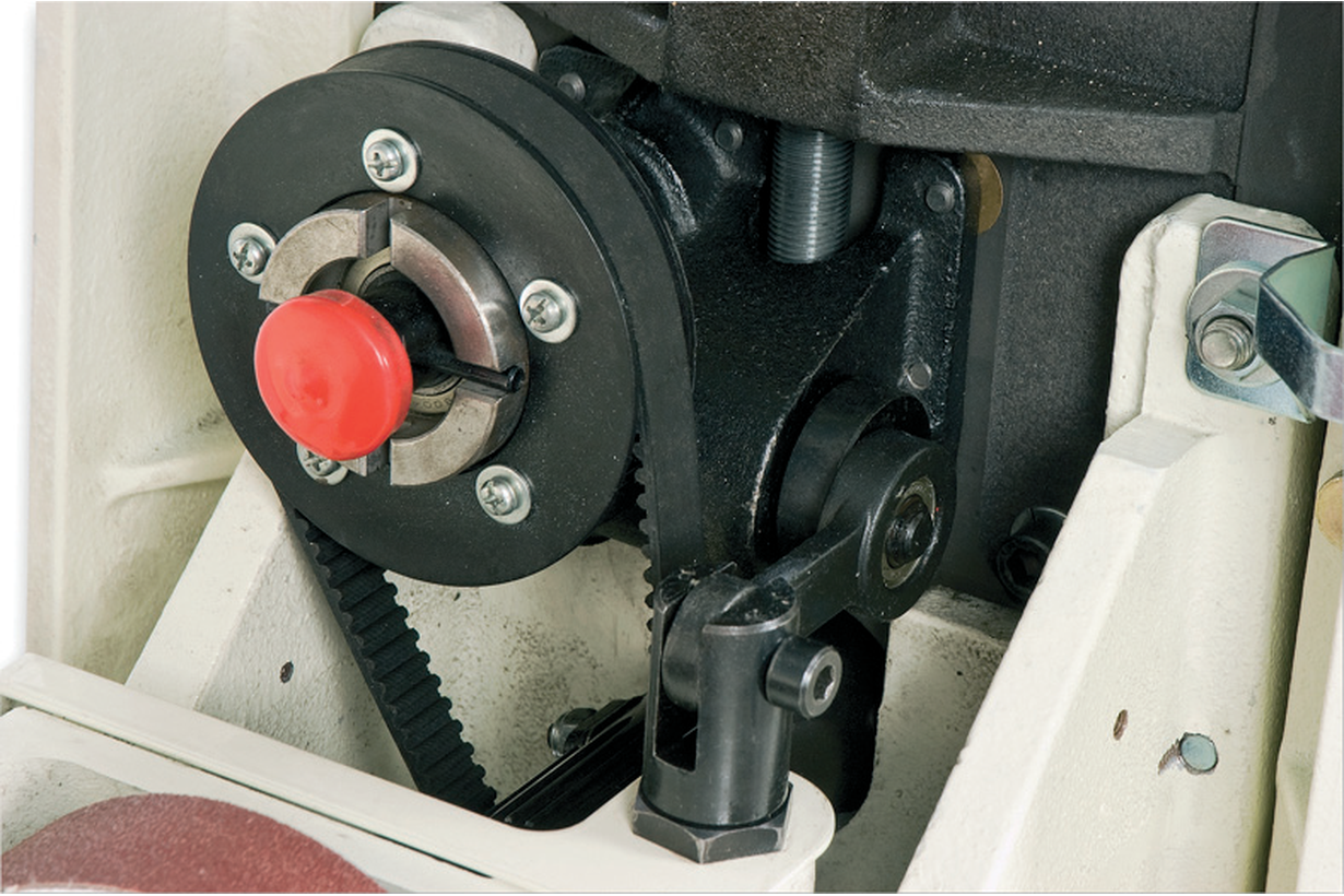 Предусмотрены все необходимые настройки: высоты установки барабана (маховиком сверху) и скорости подачи (плавная при помощи электроники). Центровка ленты транспортера производится специальными винтами и обычно требуется только после замены. Основной расходный материал – абразивная лента шириной 75 мм, она наматывается на барабан, концы фиксируются в зажимах.