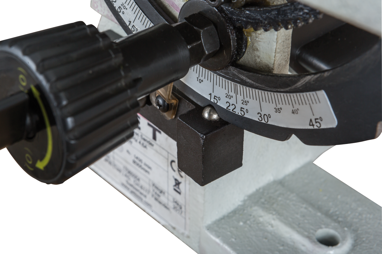 Заготовку размещают на регулируемом опорном столе. Он оборудован винтовым зажимом-фиксатором и рукояткой привода зубчато-секторного механизма, которым и производят наклон. Для контроля положения предусмотрена транспортирная шкала с четкой качественно выполненной разметкой через один градус и подпружиненные фиксаторы нескольких распространенных в обработке углов. В поверхности стола сделан Т-образный паз для скользящего углового упора или для фиксации вспомогательных приспособлений.