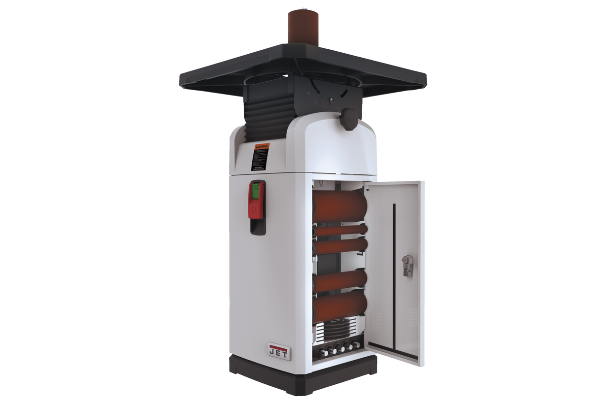 Стандартная комплектация включает в себя 10 шлифовальных шпинделей с диаметром от 6 до 100 миллиметров, а также кольцевые вставки в рабочий стол с круглым и овальным отверстием (для работы в наклонном положении стола). Расходный материал – абразивные гильзы – предлагаются со склада Jet в широком ассортименте.