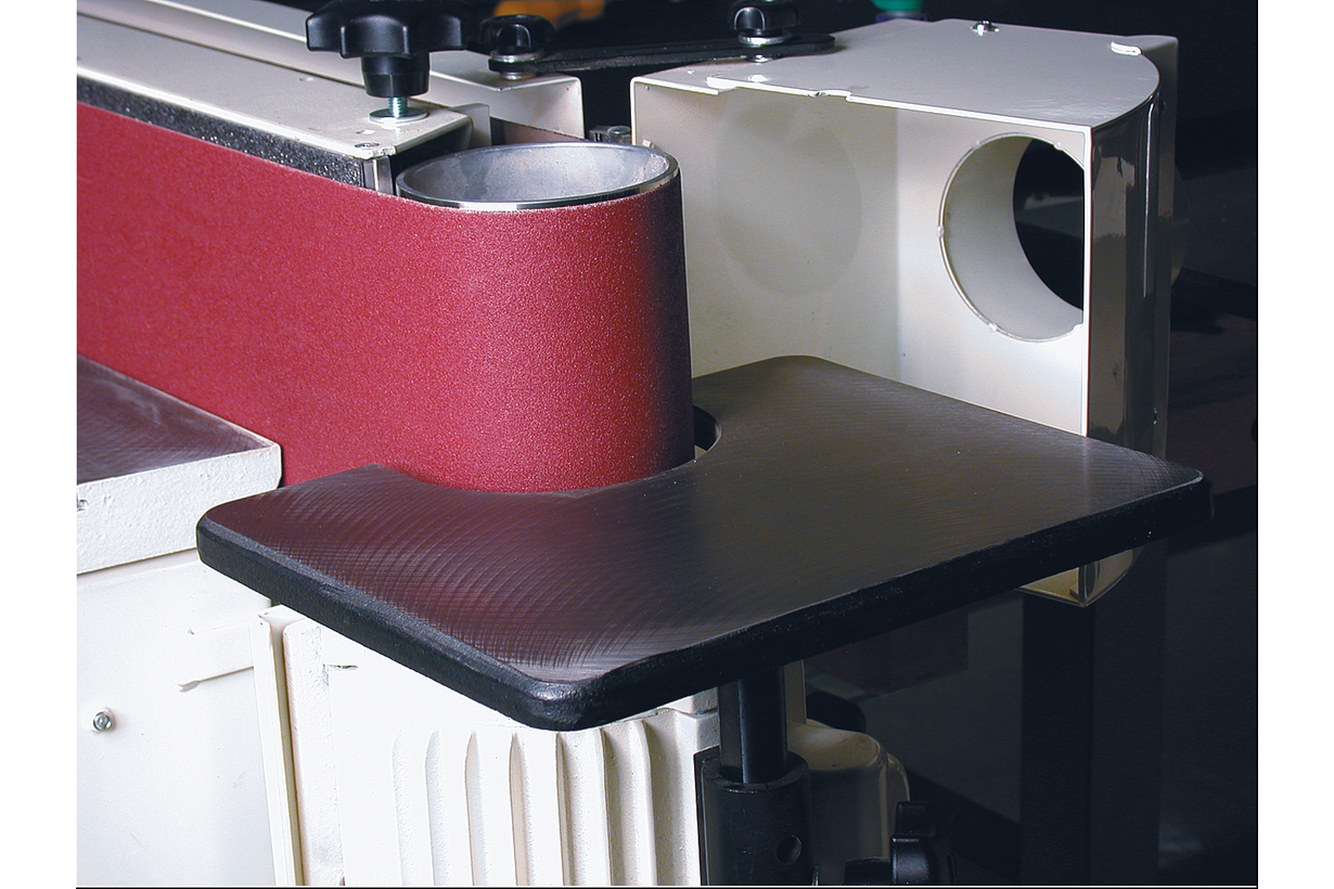 Станок оборудован выносным столом, расположенным напротив натяжного ролика ленты. На нём выполняют операции по шлифовке криволинейных кромок. Стол регулируется по высоте.