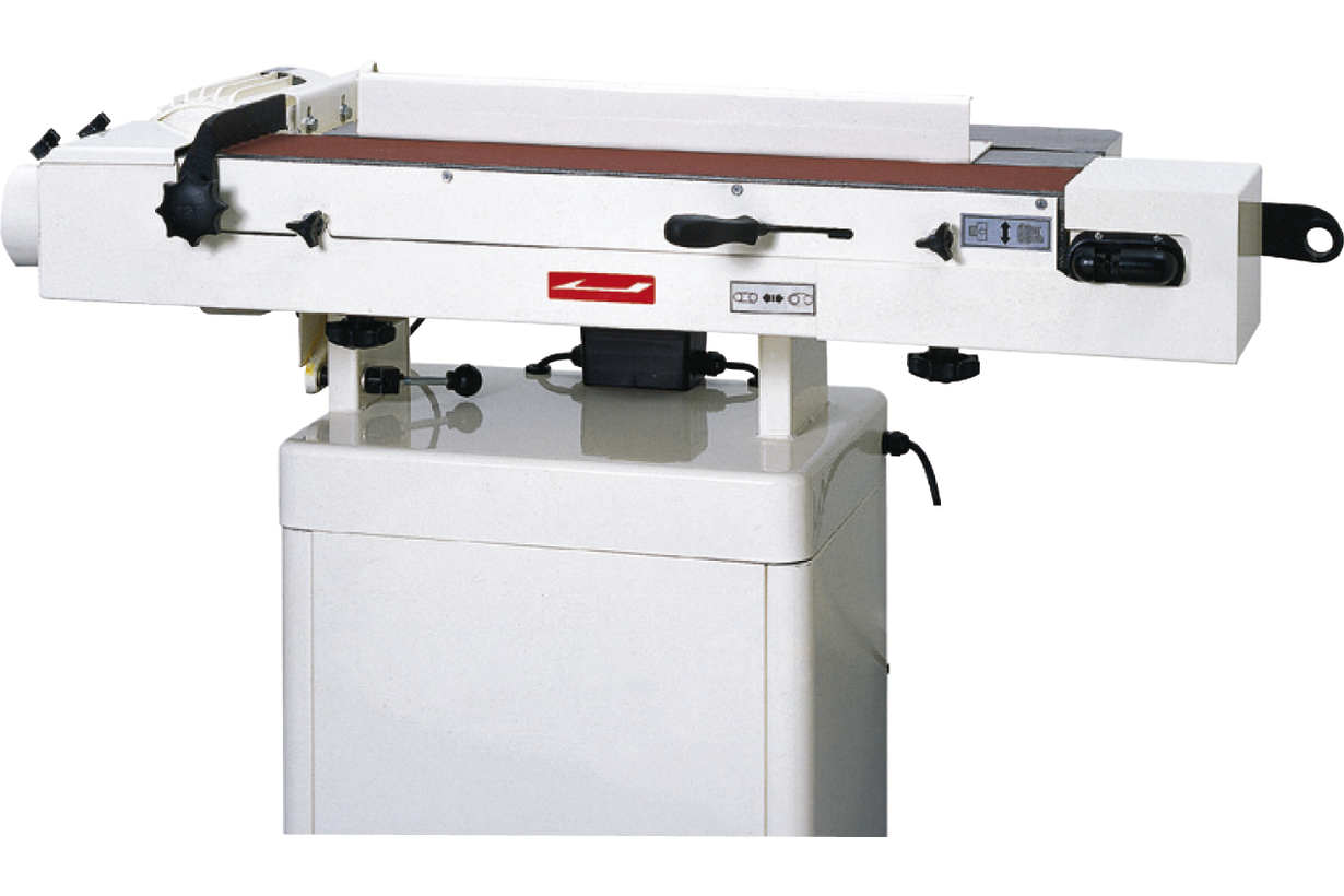 Модель оснащена вспомогательным механизмом, который за счет поворота узла переднего натяжного ролика обеспечивает колебания ленты в направлении перпендикулярном основному движению. Осцилляция способствует более эффективной работе абразива и повышает производительность станка.