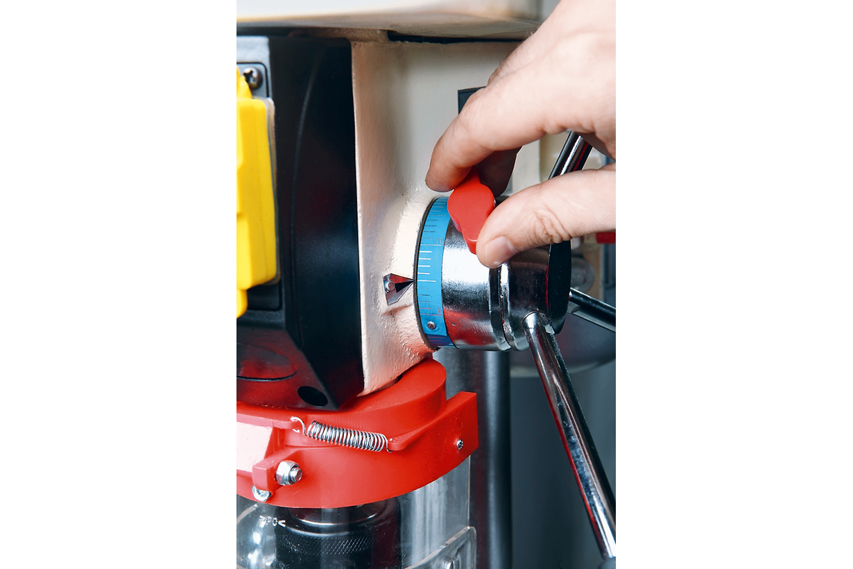 Подача пиноли шпинделя производится штурвалом, на его оси установлена муфта стопора с миллиметровой шкалой. С её помощью можно задать ограничение глубины сверления. Посадка патрона в шпиндель через конус МК-2, что позволяет применять любую другую оснастку с соответствующим хвостовиком.
