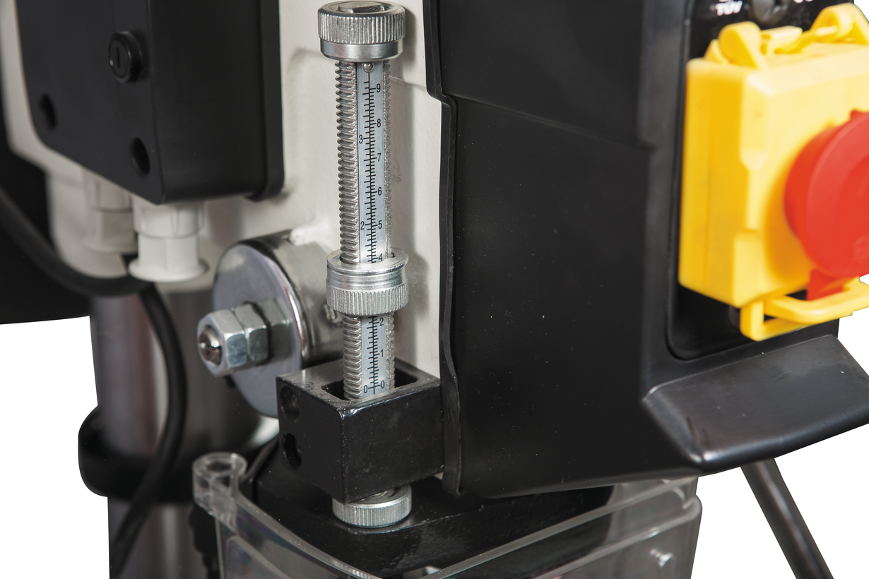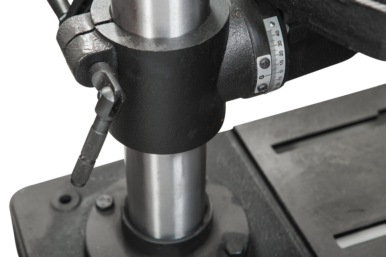 Станок укомплектован чугунным столом, регулируемым по углу установки и по высоте; реечный механизм с вращающейся рукояткой облегчает перемещение по вертикали. Сверлильная часть выполнена литой из чугуна. Для контроля глубины сверления предусмотрена шкала с миллиметровой и дюймовой разметкой, а также регулируемый ограничитель. Стандартная комплектация включает в себя удобный быстрозажимной патрон и станочные тиски для фиксации заготовок.