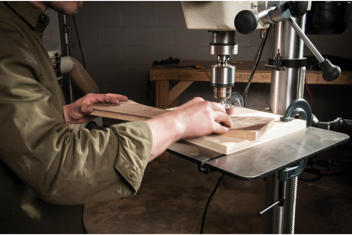 Штатно установлен 16-миллиметровый патрон с ключом, если потребуется, его несложно заменить каким-нибудь другим, конус шпинделя МК-2 это позволяет. Подача пиноли производится за один оборот штурвала на полный ход – это внушительный 127 мм или 5 дюймов в «родной» системе измерения. Отсчет глубины ведут по лимбу на кольцевой муфте, её поворотом можно задать ограничение хода – такой вариант исполнения чуть менее точный, чем винтовой на металлообрабатывающих станках, но гораздо более удобный при перенастройке в широких диапазонах значений.