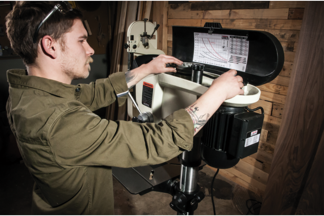 Скорость вращения патрона меняют переустановкой ремней (их два); один из них оборудован роликом-натяжителем с пластмассовой гайкой-фиксатором барашкового типа, что позволяет переставлять ремень без использования инструмента, в считанные секунды и не запачкав рук смазкой.
