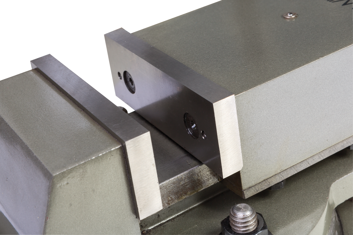 Фрезерные станочные тиски, модель MMV/SP/А-200, представляет собой многофункциональную сменную оснастку, используемую для выполнения фрезерных и сверлильных работ на станочном оборудовании. Тиски имеют чугунный литой корпус, вес которого составляет 42 кг. благодаря которому достигается устойчивое положения всей конструкции на рабочем столе. Эта модель имеет рабочий ход 200 мм и поворотный механизм, оснащенный градуированной шкалой с помощью которых достигается высокая точность позиционирования и фиксация заготовок. Приспособление оснащено губками шириной 200 мм и высотой 45 мм., создавая широкую площадь прихвата заготовок крупных размеров.
