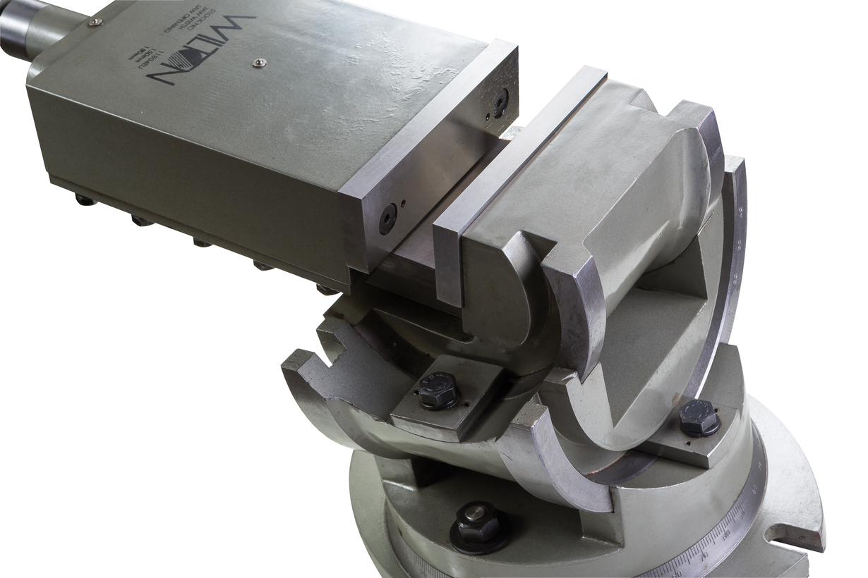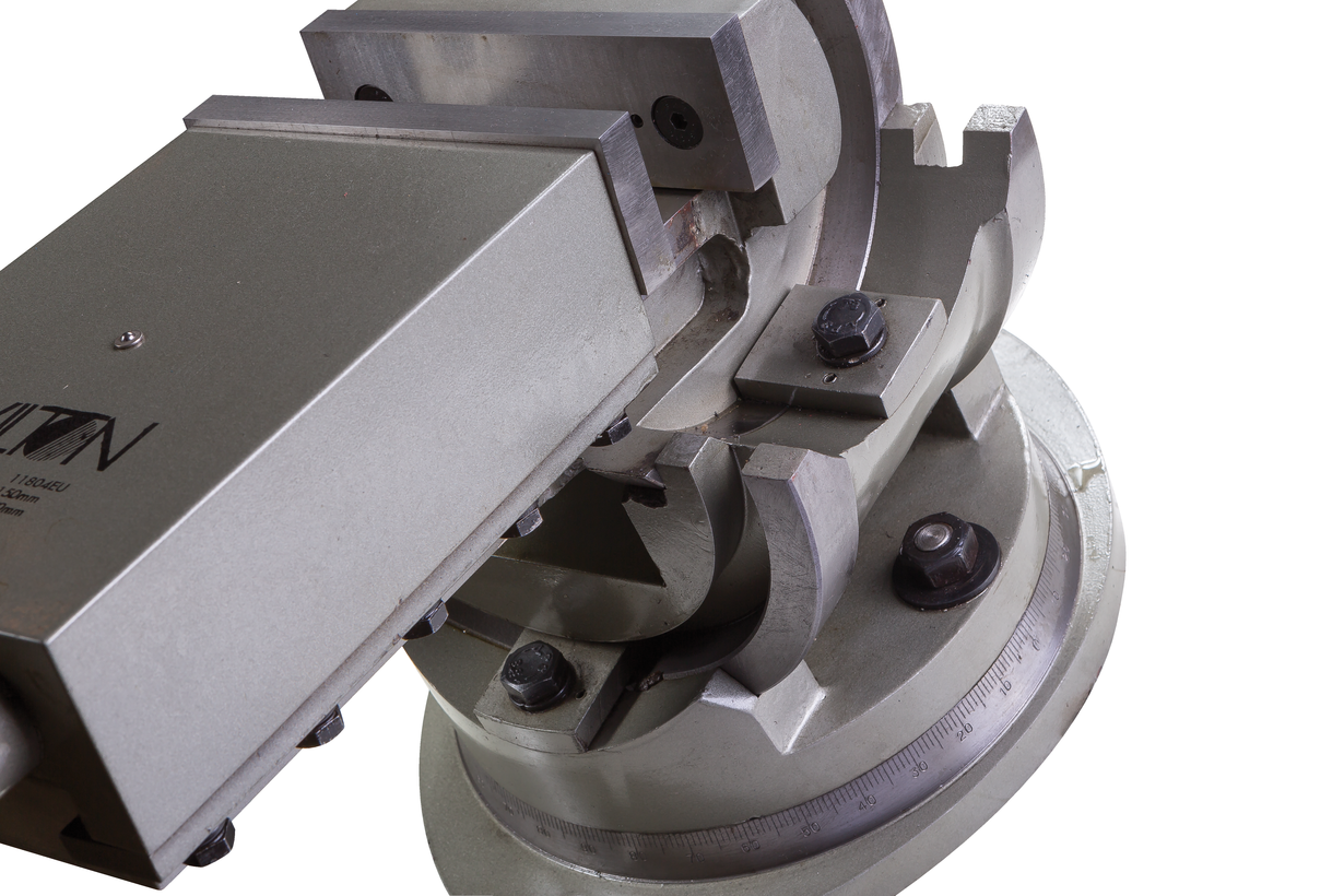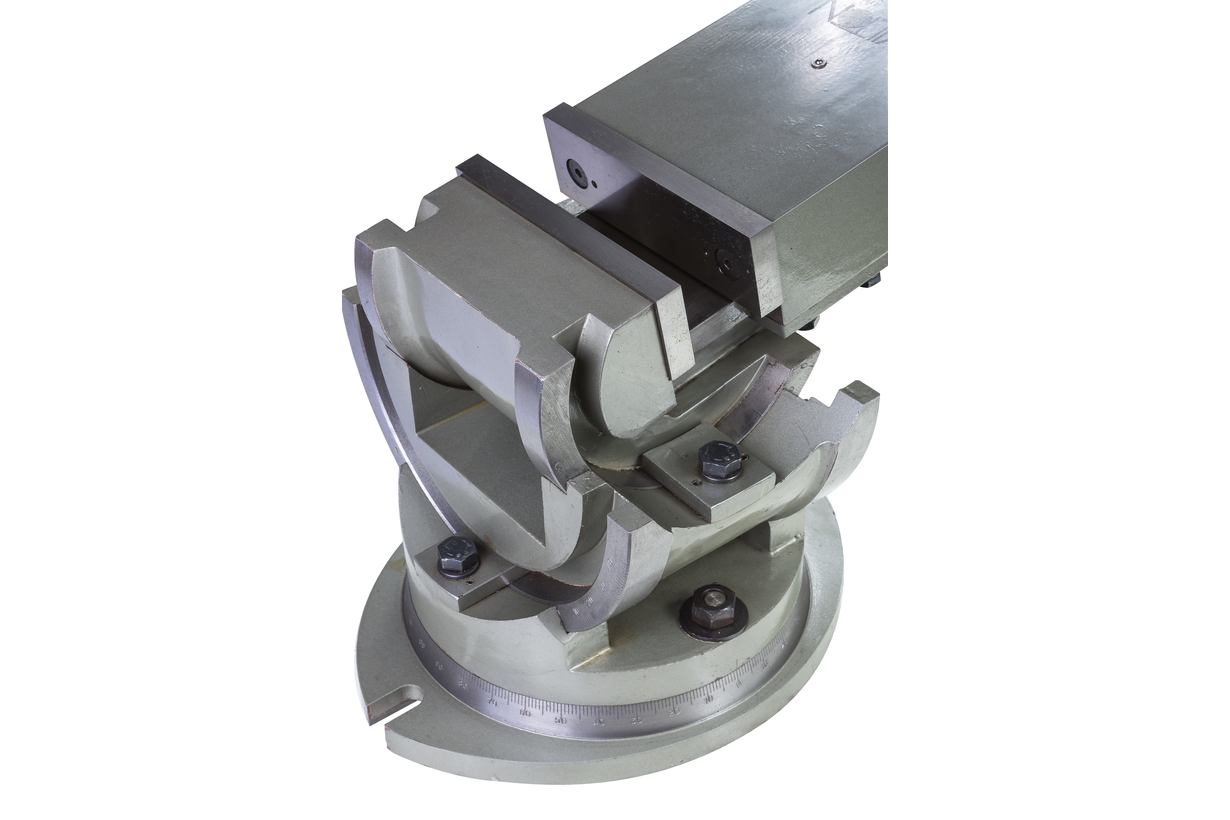 Станочные тиски, трехосевые модели TLT/SP-150 являются универсальной сменной оснасткой, применяемой для выполнения фрезерных и сверлильных работ на станочном оборудовании. Приспособление имеет прочный корпус из литейного чугуна, весом 54 кг, обеспечивающий длительный срок эксплуатации изделия и устойчивое положение на рабочем столе. Для установки на рабочем столе, тиски имеют специальные прорези и пазы. Оснастка имеет рабочий ход 150 мм, поворотный механизм и приспособление, позволяющее позиционировать заготовки и детали с высокой точностью в трех плоскостях. Приспособление обеспечивает большую зону прижима, имея губки шириной 150 мм, и высотой 45 мм.
