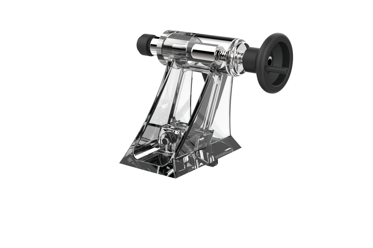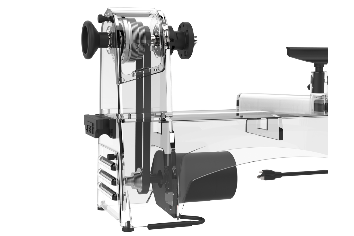 Передача вращения от двигателя на шпиндель производится 6-ручейковым поликлиновым ремнем, для выбора силового диапазона трансмиссии предусмотрено три пары шкивов. Ремень переставляют без использования вспомогательного инструмента: за натяжение отвечает рычаг с храповой фиксацией. Эксцентриковые системы крепления подручника и задней бабки делают их настройки столь же простыми и быстрыми. Станок штатно оборудован делительным приспособлением с подпружиненным штифтом фиксации шпинделя, что также упрощает монтаж / демонтаж на шпиндель планшайбы (для этого требуется всего один ключ).