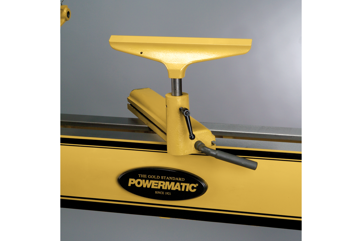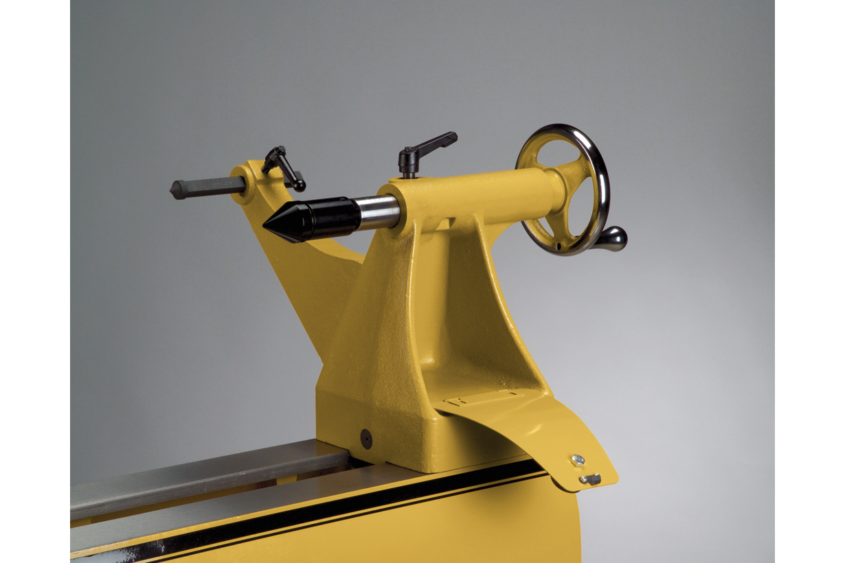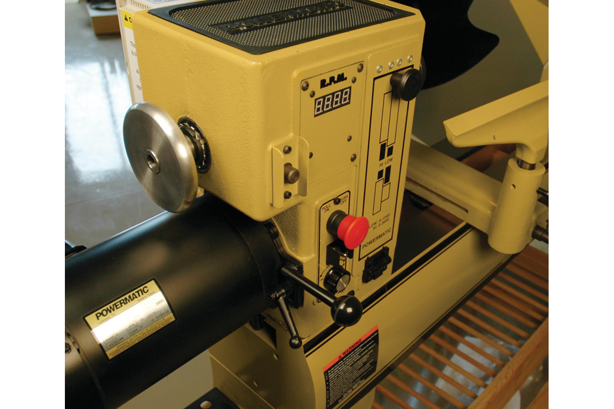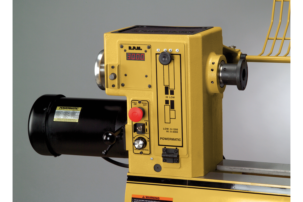 Передняя бабка выполнена подвижной и поворотной на 180 градусов, что позволяет работать с напольной или другой нештатной опорой и обрабатывать детали диаметром более 20 дюймов. Для простой и быстрой регулировки скорости вращения предусмотрен частотный преобразователь, позволяющий задать нужную скорость простым вращение электронного регулятора. Выбранное значение отображается на цифровом индикаторе. Попутно блок преобразования частоты играет роль сетевого фильтра, сглаживая перепады напряжения. В него же встроена функция торможения выбега («тормозной резистор») и переключатель реверса.