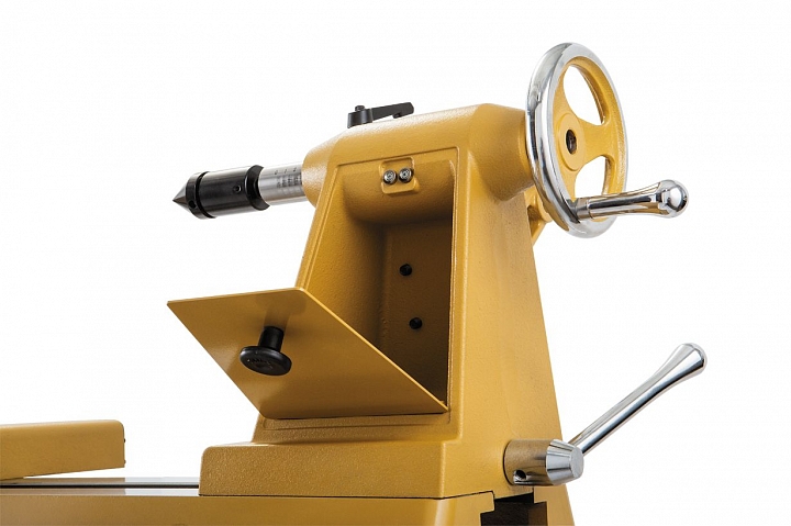 Для увеличения крутящего момента при обтачивании деталей большого диаметра можно переустановить ремень на шкивах. Натяжение производится рычагом с передней стороны бабки, который фиксируется винтовым зажимом с удобной ручкой. Есть делительное приспособление на 48 позиций и отдельный от него механизм блокировки шпинделя для удобства замены оснастки. Сама бабка подвижная вдоль станины и, кроме того, поворотная на 180° (это позволяет работать «над полом» с деталями, диаметр которых больше, чем просвет до станины). Задняя бабка с отсеком для хранения принадлежностей.
