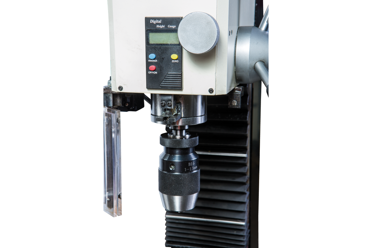 Станок должен устанавливаться на верстак или тумбу, после чего жестко зафиксирован винтами. JMD-2S поставляется в оптимальной комплектации и может быть сразу запущен в работу. Вместе с ним поставляются: зажимная тяга М10, сверлильный патрон B16 с оправкой, защитный экран, пульт управления с индикацией частоты вращения, цифровой индикатор перемещения пиноли, а также набор инструмента для обслуживания.