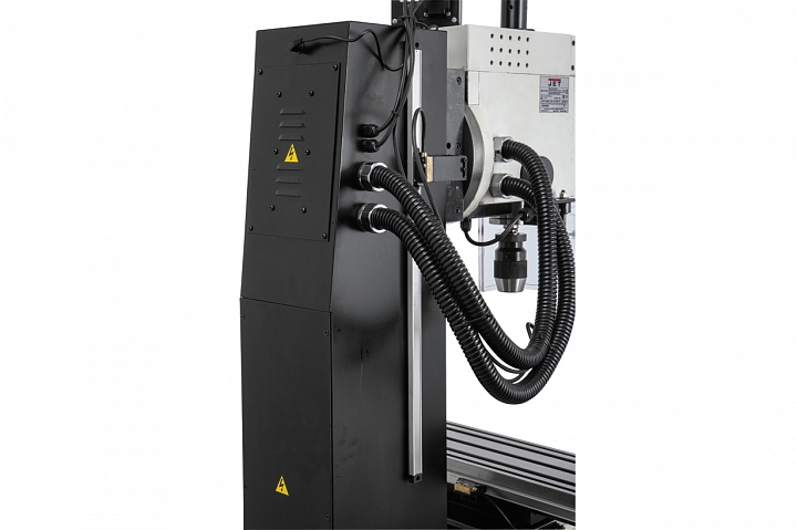 Модель JMD-3T DRO отличается прочной и устойчивой конструкцией. Станина и стойка станка изготовлена из серого чугуна, обеспечивая оборудованию устойчивость к вибрации. Сверлильно-фрезерный станок обладает возможностью поворота головы, влево на 300, вправо на 900, создавая оптимальные режимы обработки заготовок. Оборудование оснащено шпинделем с конусом МК-3, с зажимной тягой М12. Технические возможности станка позволяют легко осуществлять сверление отверстий диаметром до 20 мм. Для повышения точности обработки установлена функция микроподачи шпинделя. Ход пиноли составляет 70 мм.