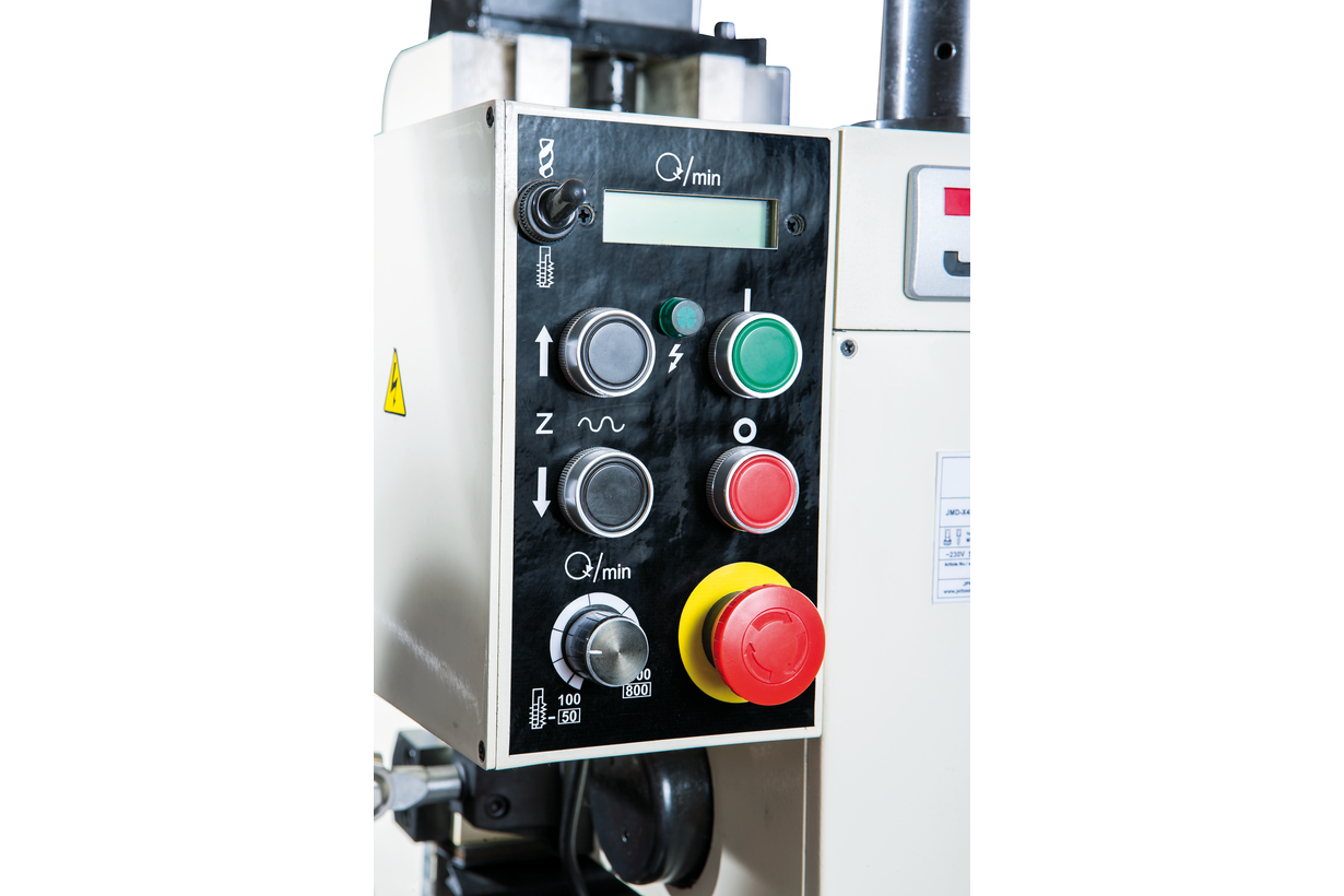 Модель имеет прочную конструкцию, выполненную из литого чугуна. Оборудование устанавливается на тумбу или монтируется на специальный верстак. Для повышения точности обработки, станок JMD-X4L оснащен механизмом микроподачи шпинделя. Цифровая индикация позволяет контролировать ход пиноли шпинделя. Поворот фрезерной головы фиксируется с помощью цифрового угломера, установленного на станке.
