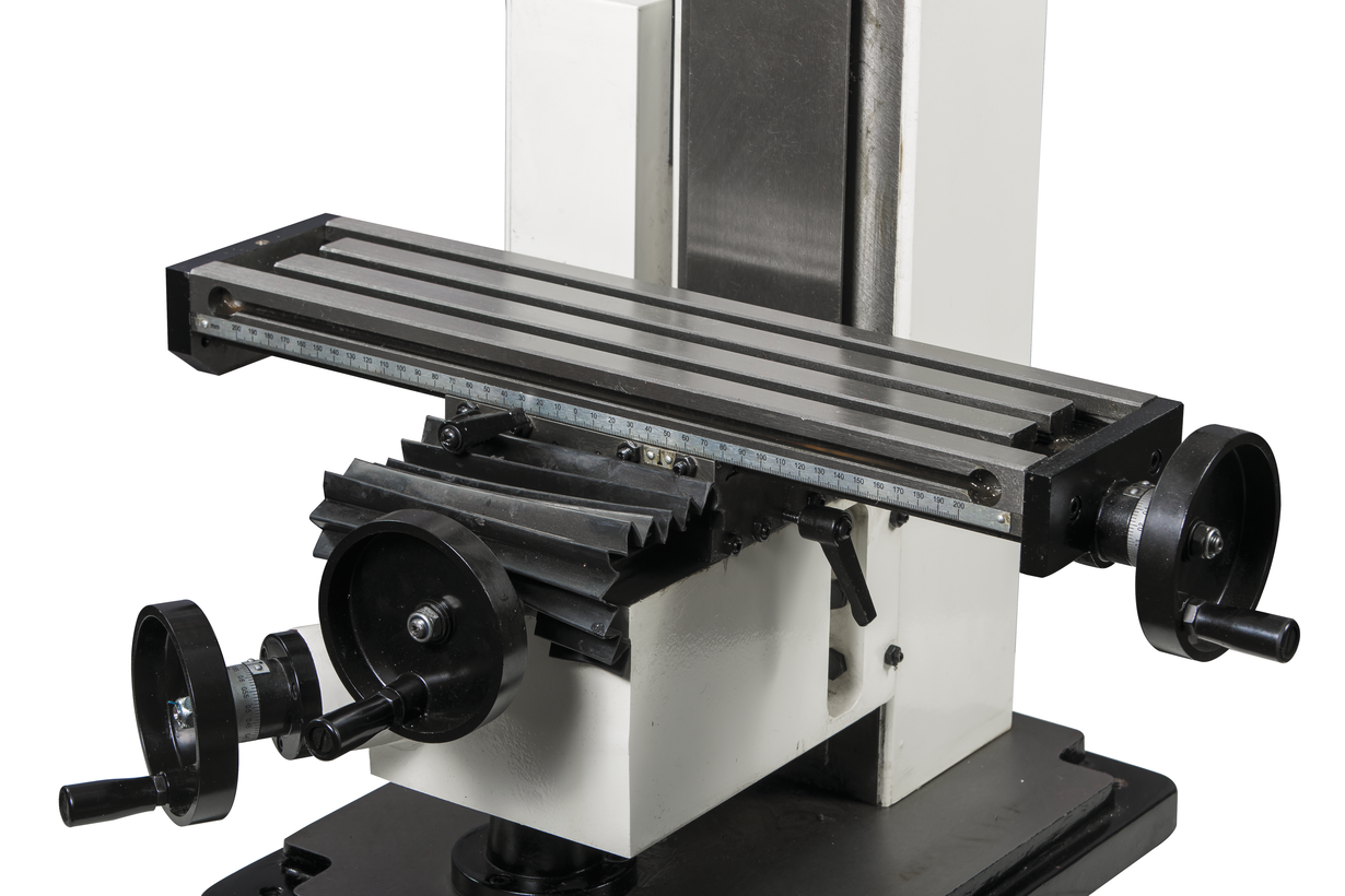 Рабочий стол оснащен Т-образными пазами в количестве 3 шт. Ширина пазов составляет 12 мм, позволяя устанавливать дополнительную оснастку, механические тиски для крепежа заготовок. Рабочая зона закрыта защитным экраном. Вес станка составляет 95 кг.