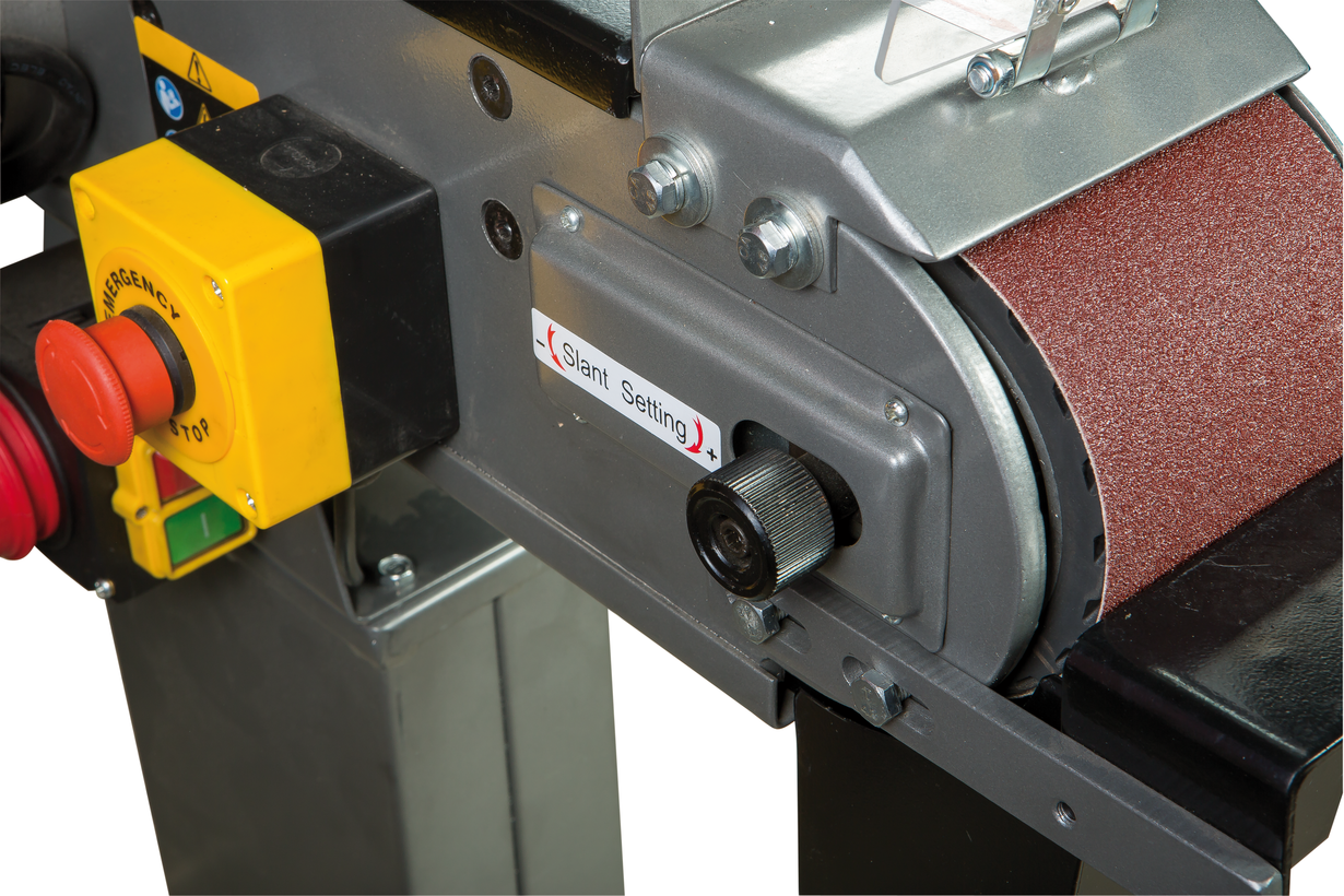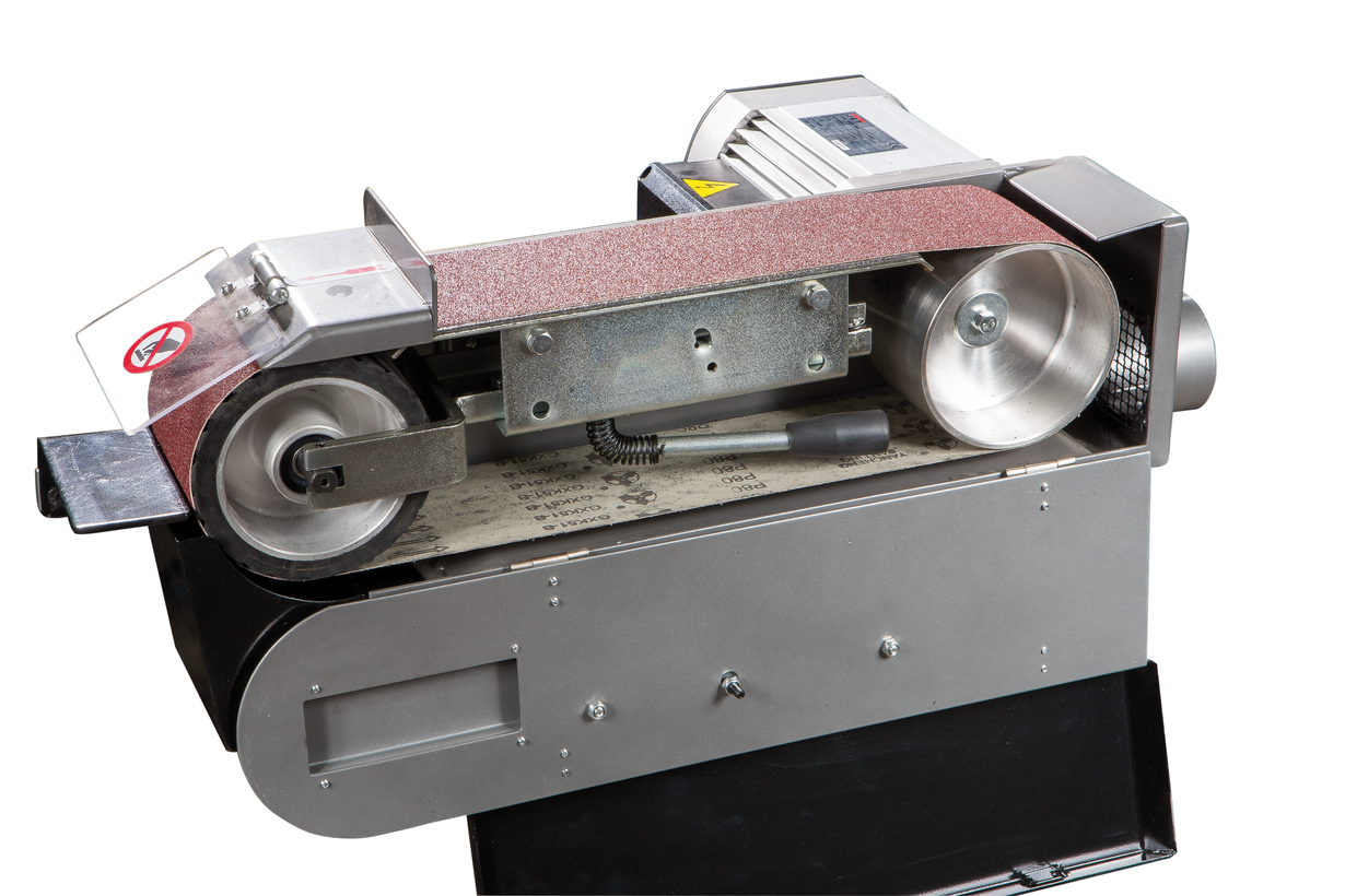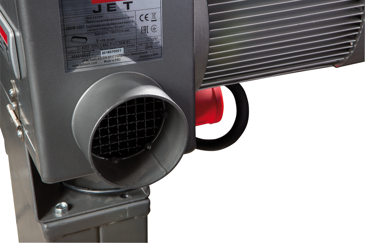 Обрезиненные направляющие роликов исключают ее проскальзывание при нагрузке. Для обеспечения безопасности оператора опасная зона рядом с ведомым роликом защищена прозрачным экраном, предусмотрена верхняя крышка ленты для тех работ, когда не требуется обработка габаритных деталей. В зоне работы оператора предусмотрена кнопка аварийного отключения питания. Поскольку в процессе шлифовки неизбежно отделение большого объема стружки и пыли, к JBSM-100 можно подключить внешний стружкопылесос (диаметр патрубка 100 мм) , также предусмотрено собственное устройство пыле-стружкоотведения с патрубком 97 мм.