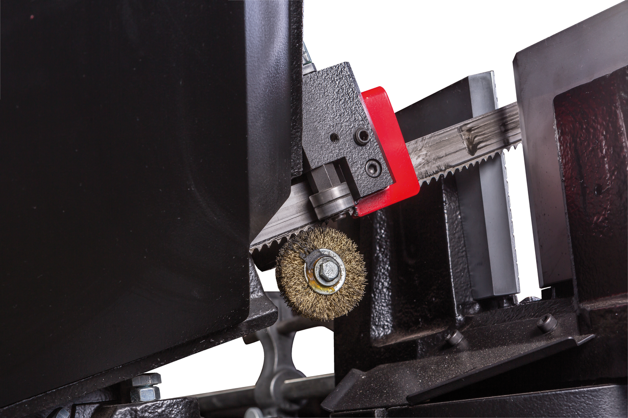 Скорость опускания регулируется так же на пульте управления, по окончанию распила рама поднимается самостоятельно на верх до конечника. Величину подъема можно регулировать, передвигая конечник на нужную величину. Скорость вращения полотна регулируется плавно, так же с пульта, скорость отображается на цифровом дисплее от 20 до 85 метров в минуту. За плавность регулировки отвечает частотник. На станке установлен двигатель мощностью 1,5 кВт. Вращение от движка передается на червячный редуктор, который увеличивает момент и понижает скорость вращения в десятки раз, редуктор вращает чугунные шкивы, на которые установлено полотно шириной 27 мм и длиной 3160 мм. Полотно зажато в направляющие. Направляющие обеспечивают перпендикулярность полотна по отношению к заготовке за счет подшипников и твердосплавных сухарей. Через направляющие подается СОЖ, которая обеспечивает охлаждение заготовки и вывод стружки из зоны реза.
