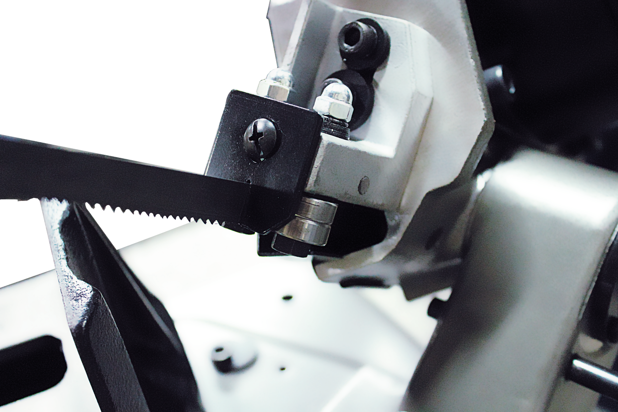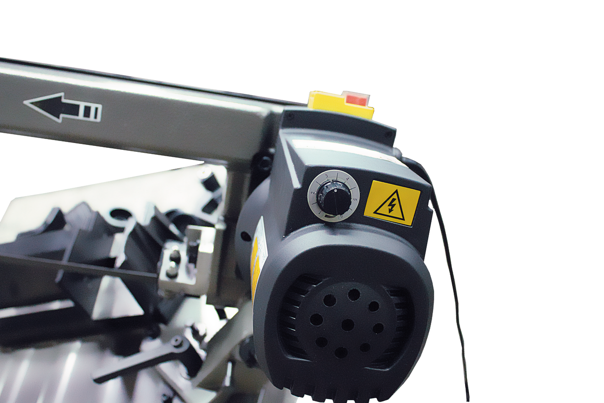 Работу станка обеспечивает экономичный электродвигатель мощностью 1,1 кВт. Особенность данной модели заключается в наличии плавной регулировки скорости движения полотна. Частотный преобразователь позволяет варьировать скорость движения ленточной пилы в диапазоне 25-80 м/мин. Точность распила достигается наличием направляющих, поддерживающих полотно в вертикальном положении. Направляющие свободно передвигаются по раме, регулируя диаметр распила и сокращая увод полотна. Для повышения точности распила станок имеет подшипники, установленные в направляющих. Сила натяжения пилы регулируется вручную, маховиком, расположенного в левой части рамы.