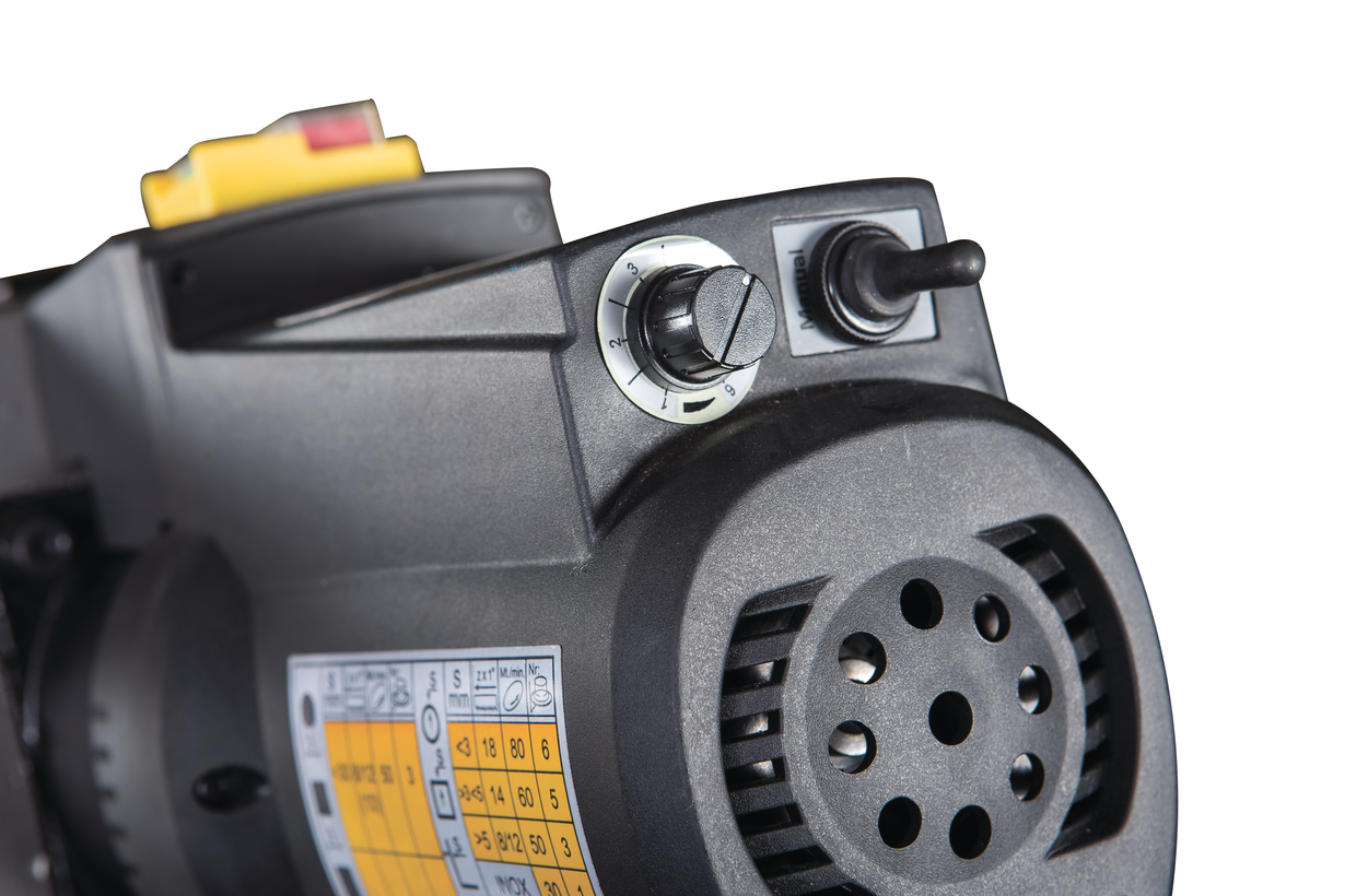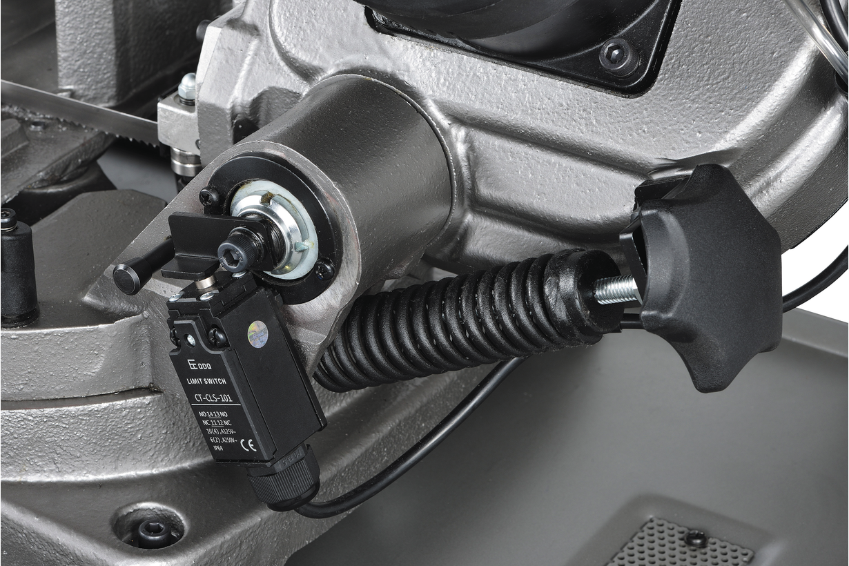 Мощный экономичный электродвигатель мощностью 1,5 кВт, обеспечивает бесперебойную работу станка в различных скоростных режимах. Наличие частотного преобразователя позволяет плавно регулировать скорость движения ленточного полотна, в зависимости от жесткости материала обрабатываемой заготовки. Частотный преобразователь обеспечивает скорость движение полотна в диапазоне 30-80 м/мин. Станок имеет направляющие, обеспечивающие позиционирование ленточного плотна в необходимом положении. Перемещение направляющих по раме создает оптимальный режим движения ленточного полотна, предотвращает увод полотна и обеспечивает качество распила. В направляющих установлены подшипники, фиксирующие ленточную пилу в вертикальном положении и обеспечивающие точность обработки заготовки. Натяжение пилы регулируется ручным способом при помощи маховика, расположенного в левой части пильной рамы. Крепление заготовок на станок осуществляется с помощью механических тисков. Концевой упор облегчает установку заготовок при повторении однотипной операции.