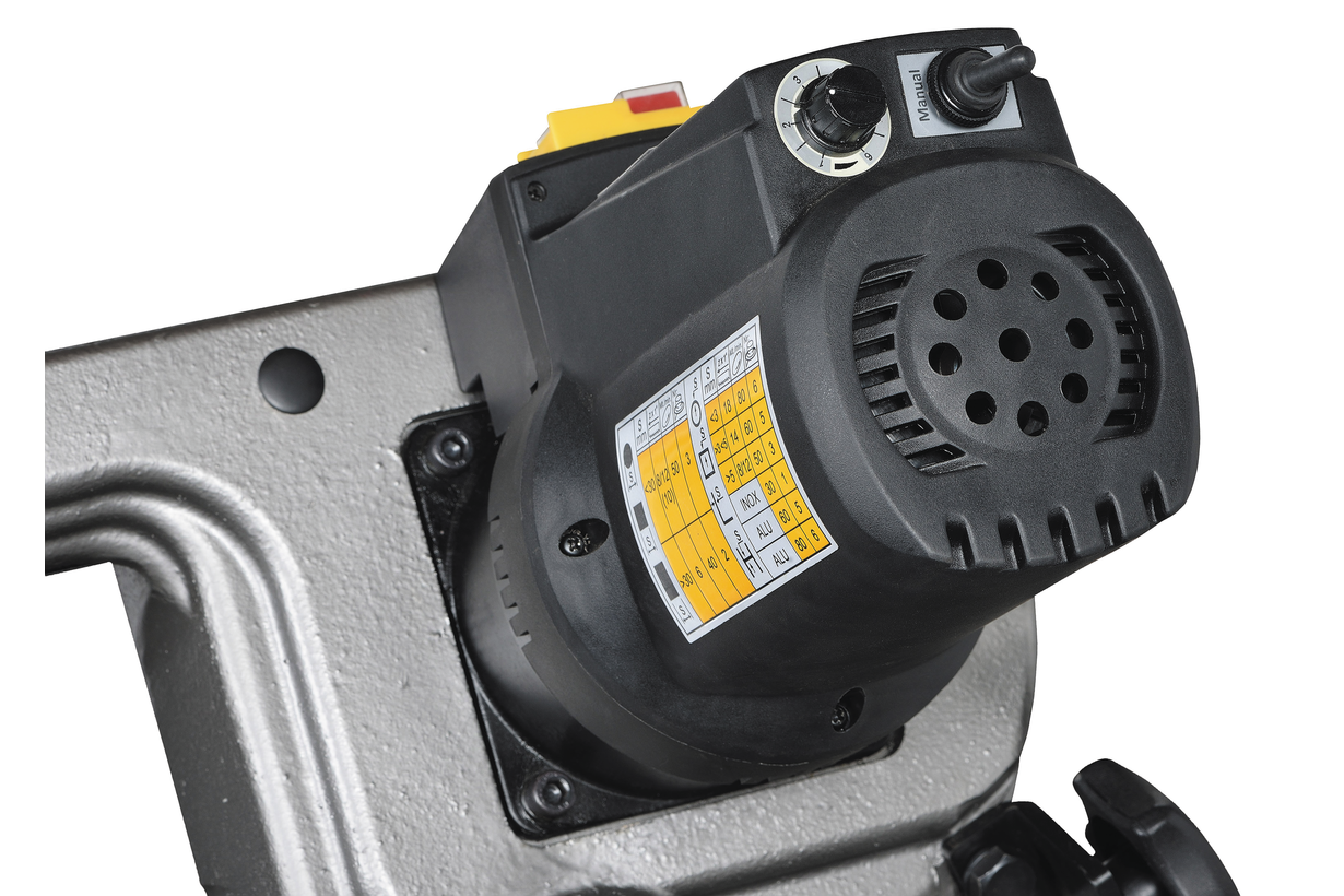 Модель оснащена экономичным электродвигателем мощностью 1,5 кВт. Станок имеет плавную регулировку скорости движения полотна, обеспечиваемую работой частотного преобразователя. Устройство позволяет изменять движения ленточного полотна в диапазоне 30-80 м/мин. Качество распила обеспечивается направляющими, регулирующие проход полотна. Направляющие свободно передвигаются по раме в зависимости от диаметра заготовки, уменьшает уводку полотна. Точность распила обеспечивается наличием в конструкции подшипников, установленных в направляющих и обеспечивающих позиционирование ленточного полотна строго в вертикальном положении, относительно заготовки. Натяжение ленточного полотна регулируется маховиком, ручным способом.