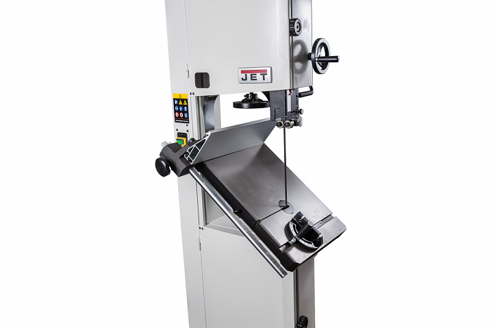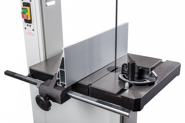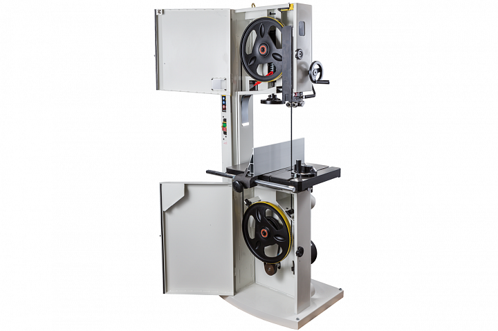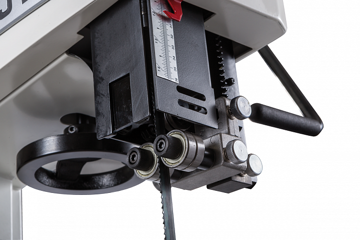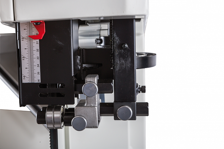 Механизм натяжения и центрирования ленты включает в себя две группы трехроликовых направляющих на шарикоподшипниках, стрелочный индикатор уровня натяжения, регулирующие маховики, два смотровых окошка и рычаг быстрого натяжения-ослабления. Он не совсем обычен, поскольку имеет не два, а три фиксированных положения: рабочее (плотно натянуто), для хранения (лента ослаблена, но держится на шкивах) и сервисное (для замены полотна). Чтобы улучшить плавность работы, использованы чугунные шкивы с массивным телом, а не в виде спицованных колес, как раньше.