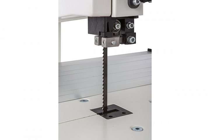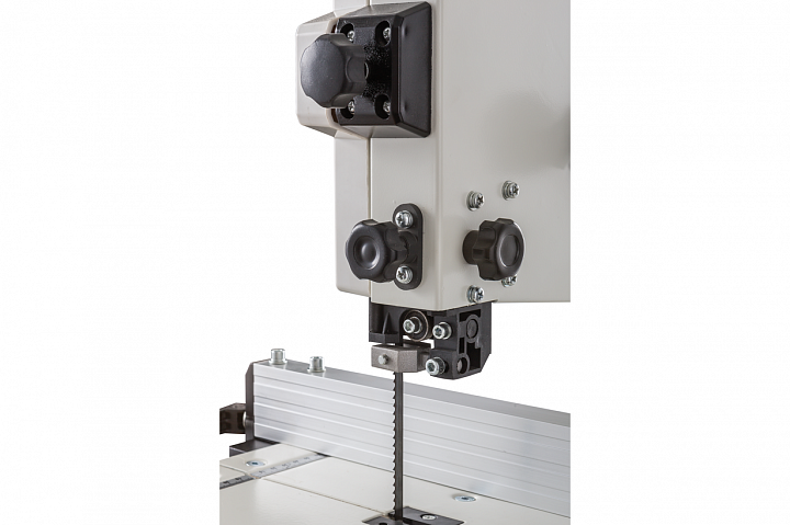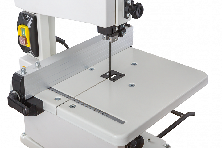 Jet JWBS-8-M компактный ленточнопильный станок для хобби и эпизодических работ по дому, гаражу или хозяйству. Его устройство очень рационально, что позволило реализовать все стандартные функции ленточной пилы, не усложняя конструкцию. Ведущий шкив диаметром 210 мм установлен прямо на вал двигателя: он делает 1420 оборотов в минуту и понижающий редуктор не требуется. Направляющие полотна изготовлены в виде цилиндрических штифтов, которые удерживают ленту своими торцами. По мере износа или при замене ленты их регулируют, сдвигая вдоль оси и зажимая винтами с шестигранником. Продольную опору обеспечивает ролик с шарикоподшипником. Весь верхний узел опускается и поднимается в зависимости от толщины заготовки; аналогично устроенный нижний узел неподвижно закреплен под рабочим столом.