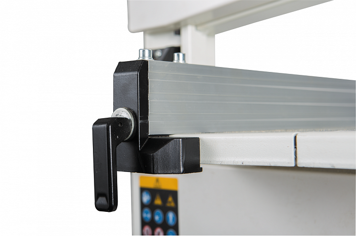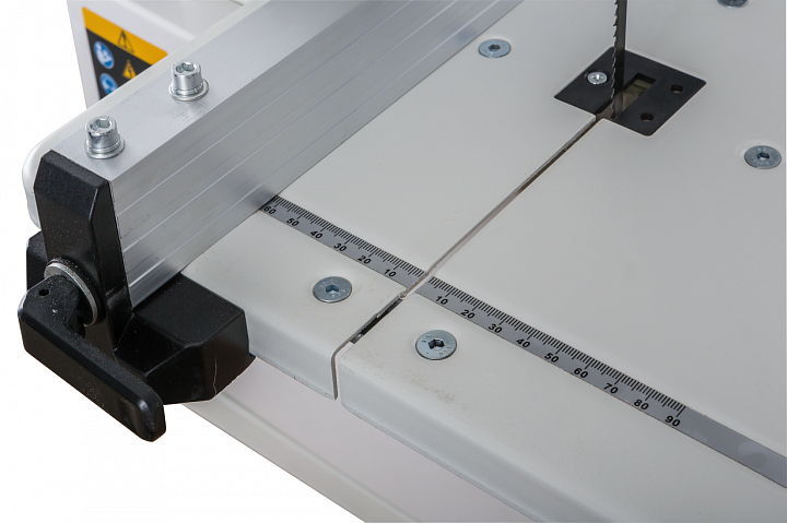 Для распиловки по прямой в комплект станка включен параллельный упор. Он фиксируется на отбортовке стола и перемещается вдоль края влево или вправо. Для удобства настройки предусмотрена миллиметровая шкала с началом отсчета в плоскости реза. Для выполнения угловых распилов стол можно наклонять на угол до 45 градусов.