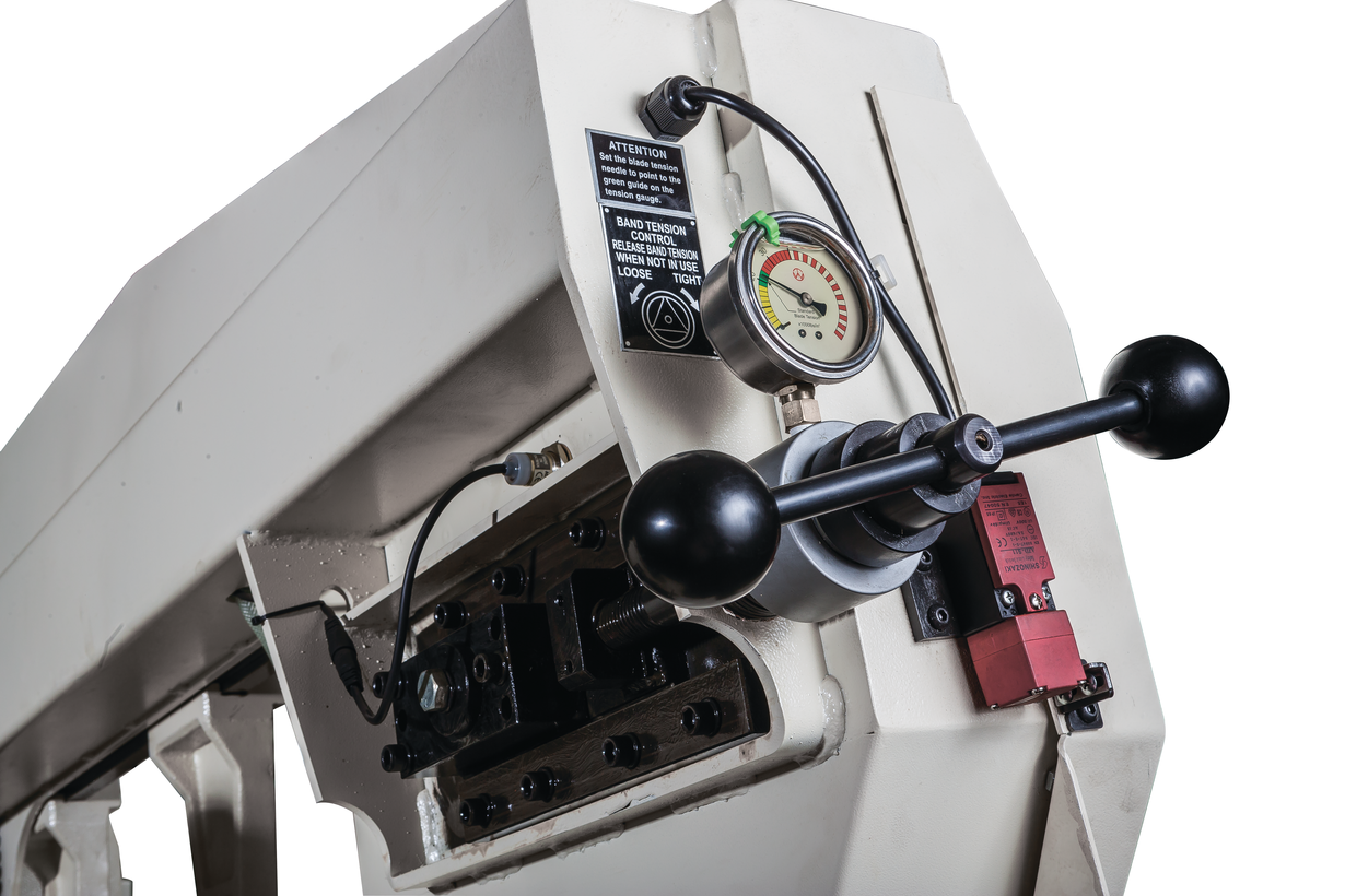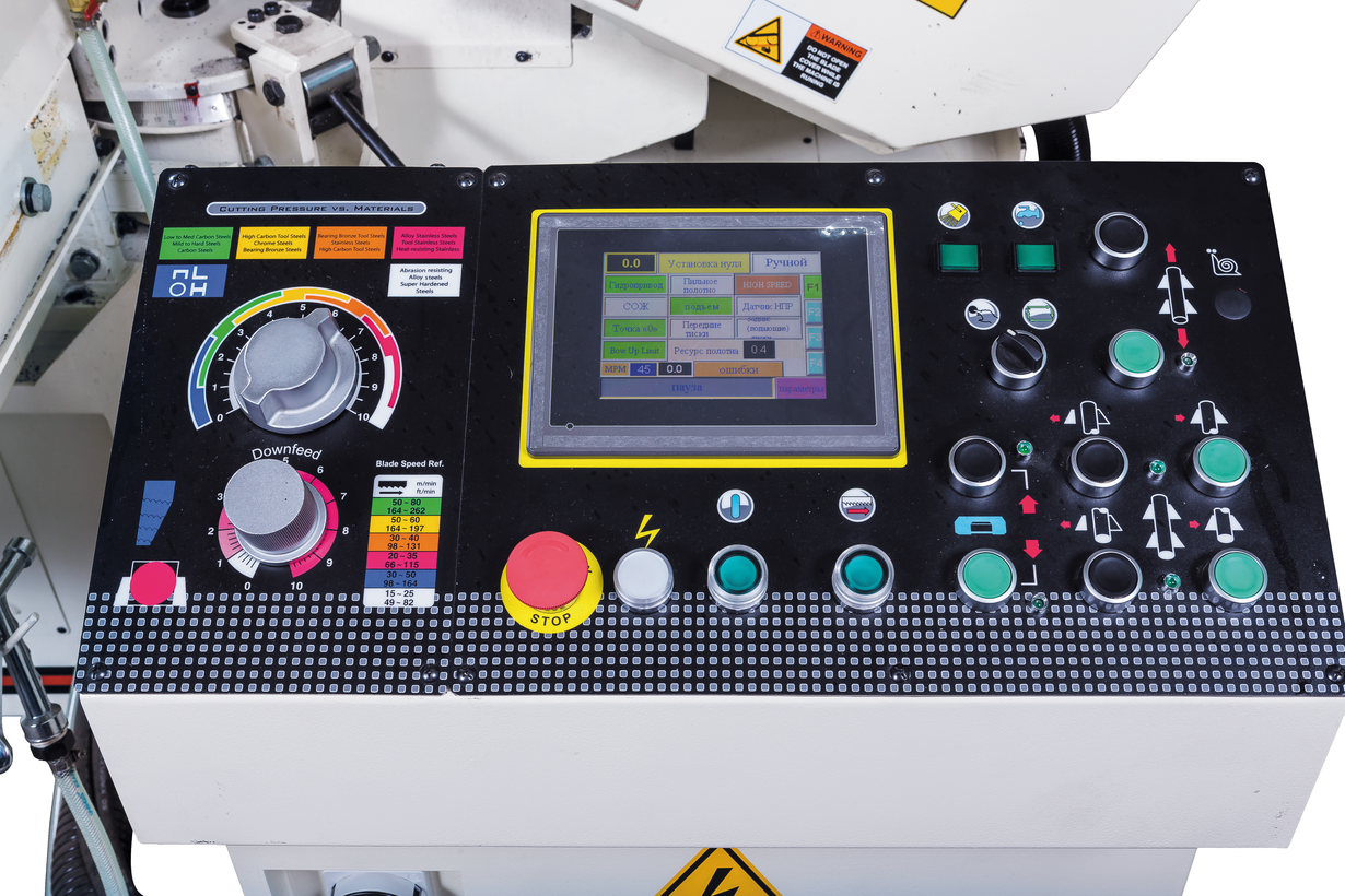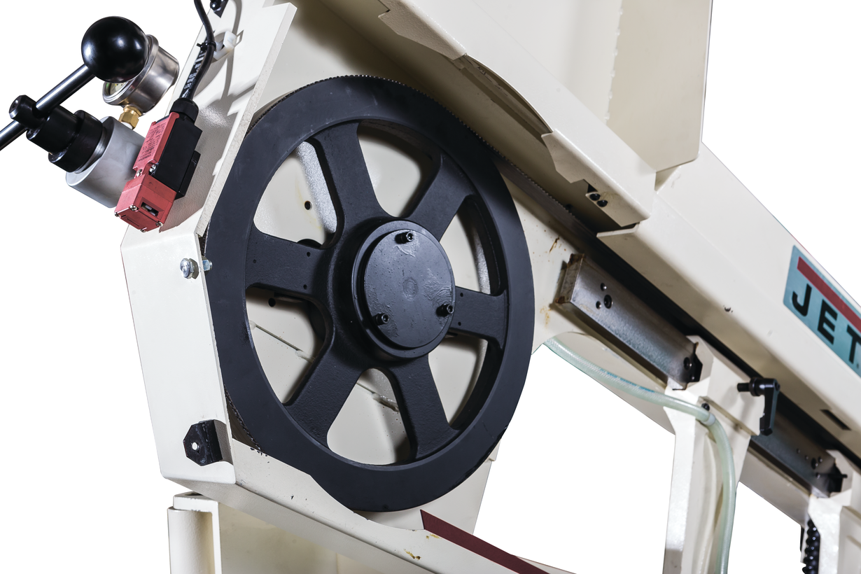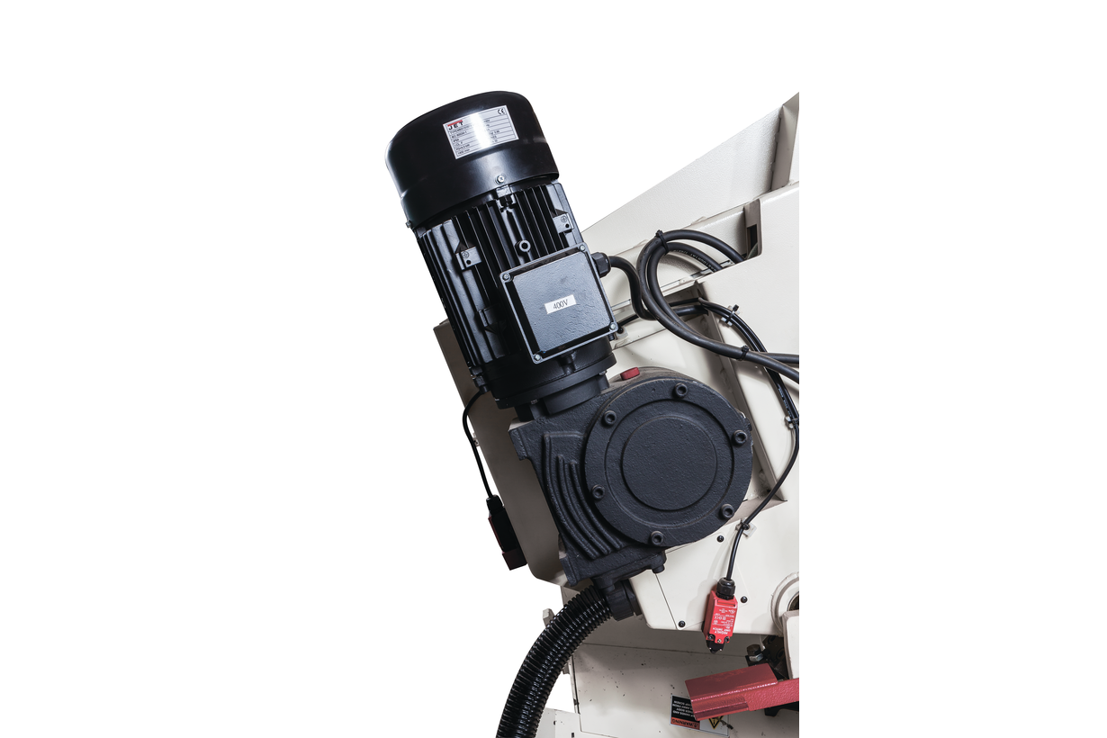 Модель имеет на оснащении электродвигатель, мощность которого составляет 3,75 кВт, обеспечивающий плавную скорость движения ленточного полотна в диапазоне 20-70 м/мин. Регулировка скорости движения полотна выполняется с пульта управления. Сила натяжения полотна регулируется с пульта управления, учитывая показания тензометра. Привод тисков, регулировка скорости движения полотна, сила прижима консоли на обрабатываемую заготовку регулируются с пульта управлением станка.