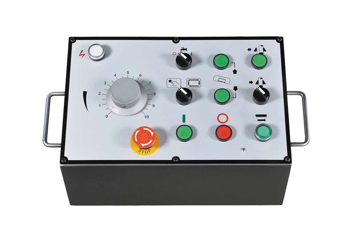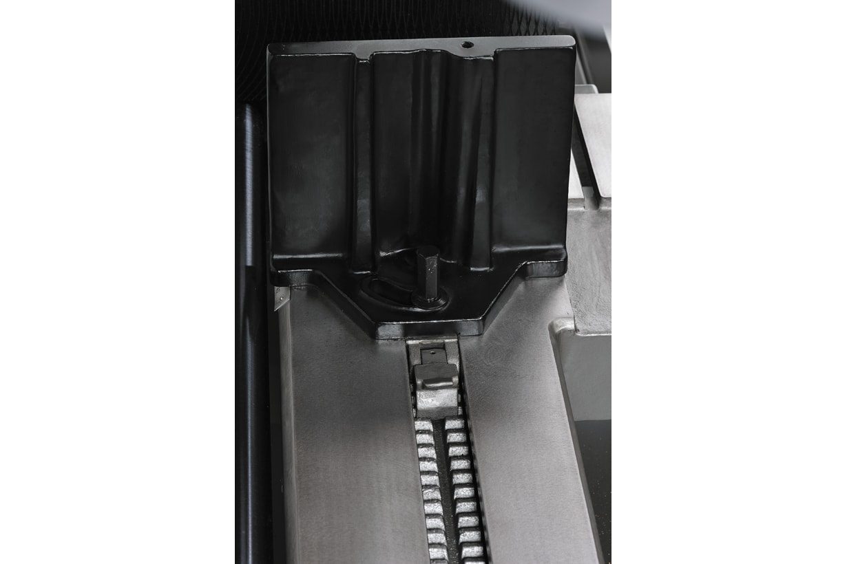 В направляющих находятся подшипники и сухари, которые выворачивают полотно до 90 градусов по отношению к заготовке, и, тем самым, гарантируют минимальные отклонения и уводки. Скорость вращения полотна регулируется плавно от 20 до 66 метров в минуту, за регулировку отвечает клиновой-ременный вариатор, установленный прямо на двигатель.