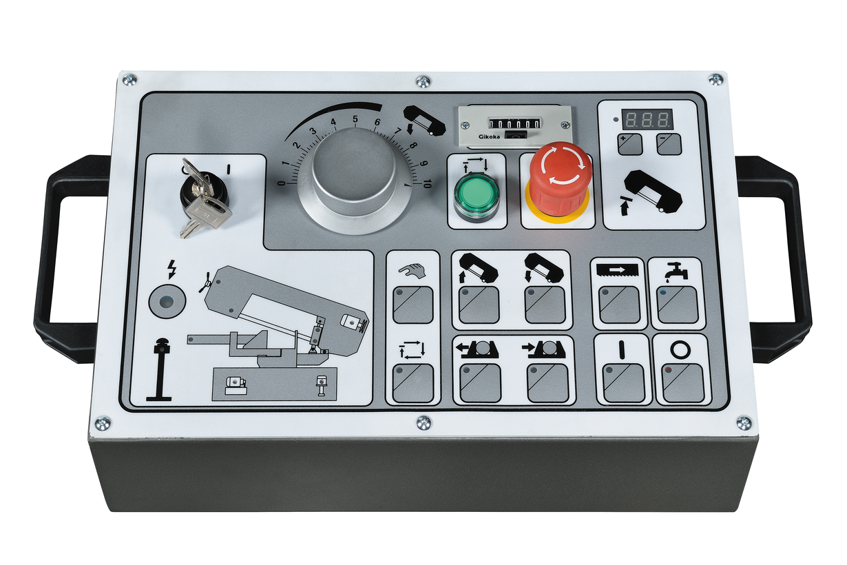 Ленточнопильный станок этой модели оснащен экономичным электродвигателем большой мощности - 3,7 кВт, позволяющий выполнять длительную обработку, работать в тяжелых технологических режимах. Редуктор обеспечивает плавное вращение шкивов. Наличие вариатора позволяет устанавливать необходимую скорость движения ленточного полотна в диапазоне 26-80 м/мин. Управление моторной группой и режимами работы осуществляется с пульта управления, выделенного в отдельный блок. Оборудование оснащено датчиком контроля технологического процесса, сообщающим об имеющихся ошибках на концевиках.
