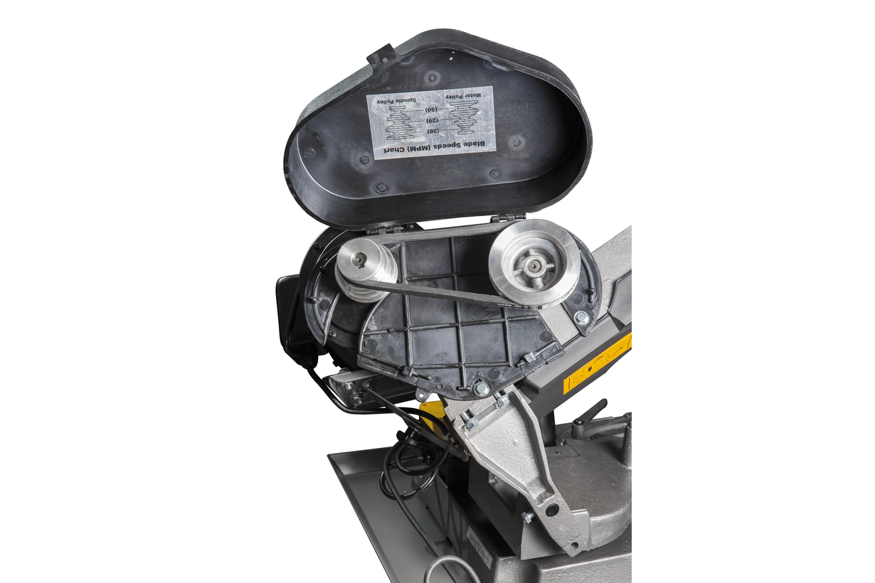 Модель оснащена электродвигателем, мощность которого составляет 0,35 кВт. Ременная передача позволяет использовать в процессе работы три скорости движения ленточного полотна, 20,30 и 50 м/мин. Регулировка хода полотна осуществляется путем поворота двух винтов, расположенных в левой части пильной рамы. Натяжение пилы выполняется в ручном режиме, используя для этой цели маховик, установленный слева, в торцевой части консоли.