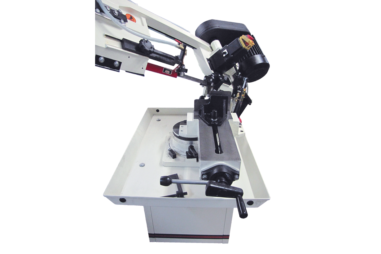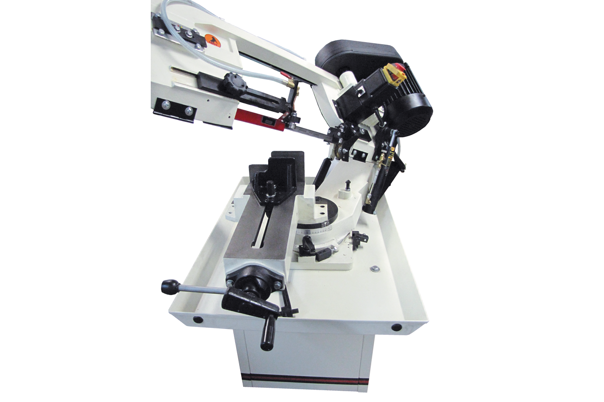 Пильная рама оборудована направляющими, обеспечивающими регулировку прохода пила в зависимости от диаметра заготовки. Направляющие имеют эксцентриковые подшипники, благодаря которым осуществляется позиционирование ленточного полотна в строго вертикальном положении относительно заготовки. Натяжение полотна выполняется в ручном режиме. Для этой цели в торцевой части консоли имеется маховик. Установка и крепление заготовки обеспечивается механическими быстрозажимными тисками. Быстрая фиксация заготовок одного диаметра выполняется с помощью рычага.