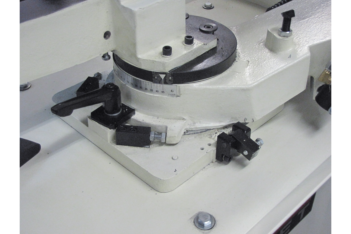 Модель MBS-712 представляет собой ленточнопильный станок европейского типа, с поворотной консолью. Используется в промышленном производстве для пиления металлических заготовок под разными углами. Допустимый диаметр пиления заготовок под углом 90 градусов составляет 178 мм. Под углом в 45 градусов допускается пиление заготовок диаметром до 127 мм. Установка необходимого угла распила обеспечивается путем поворота рамы. Положение и фиксация рамы в необходимом положении осуществляется с помощью шкалы. Станок имеет тяжелую пильную раму, скорость подачи которой в зону резания обеспечивает система гидроразгрузки. Наличие гидроцилиндра создает необходимое прижимное усилие для рамы на обрабатываемую заготовку, уменьшает физические нагрузки на оператора в процессе работы.