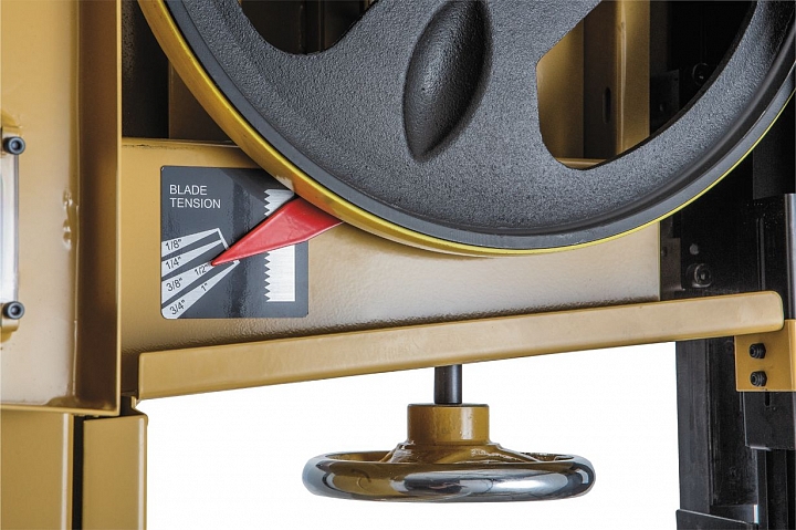 В основе станка жесткая стальная рама, на которой установлены чугунные шкивы с полиуретановым покрытием и чугунный стол с кронштейном из этого же материала. Для натяжения ленты предусмотрен рычаг, имеющий следующие позиции: «работа»/ «хранение»/ «замена». Фиксация полотна производится трехточечными роликовыми направляющими с шарикоподшипниками. Верхние направляющие установлены на подвижной рейке с зубчатым механизмом подъема и опускания, приводимым от массивного хромированного маховика с рукояткой.