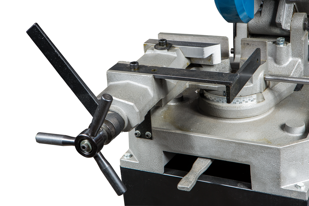 Отрезной станок имеет быстрозажимные тиски, позволяющие выполнять быструю установку однотипных заготовок. Для серийных работ, при частом повторении однотипных операции в конструкции станка предусмотрен концевой упор, регулирующий необходимую длину заготовок. Станок имеет на оснащении мощный электродвигатель - 1 кВт, способный обеспечить скорость вращения пильного диска 42 об/мин. Модификация станка с питанием от сети в 380 В, позволяет выполнять работу в 2-х режимах скорости вращения пильного диска – 42 и 84 об/мин. Управление работой двигателя осуществляется оператором с помощью регулятора скорости вращения. Двигатель оборудован кнопкой аварийной остановки двигателя.