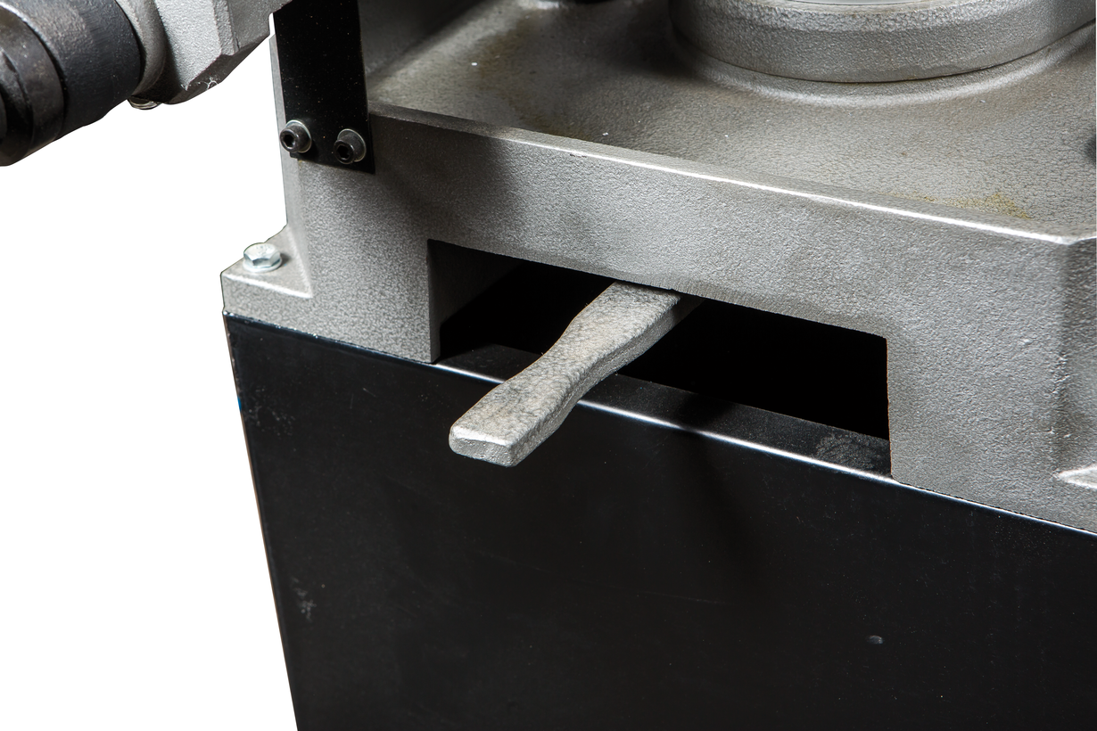 Отрезной станок имеет быстрозажимные тиски, позволяющие выполнять быструю установку однотипных заготовок. Для серийных работ, при частом повторении однотипных операции в конструкции станка предусмотрен концевой упор, регулирующий необходимую длину заготовок. Станок имеет на оснащении мощный электродвигатель - 1 кВт, способный обеспечить скорость вращения пильного диска 42 об/мин. Модификация станка с питанием от сети в 380 В, позволяет выполнять работу в 2-х режимах скорости вращения пильного диска – 42 и 84 об/мин. Управление работой двигателя осуществляется оператором с помощью регулятора скорости вращения. Двигатель оборудован кнопкой аварийной остановки двигателя.
