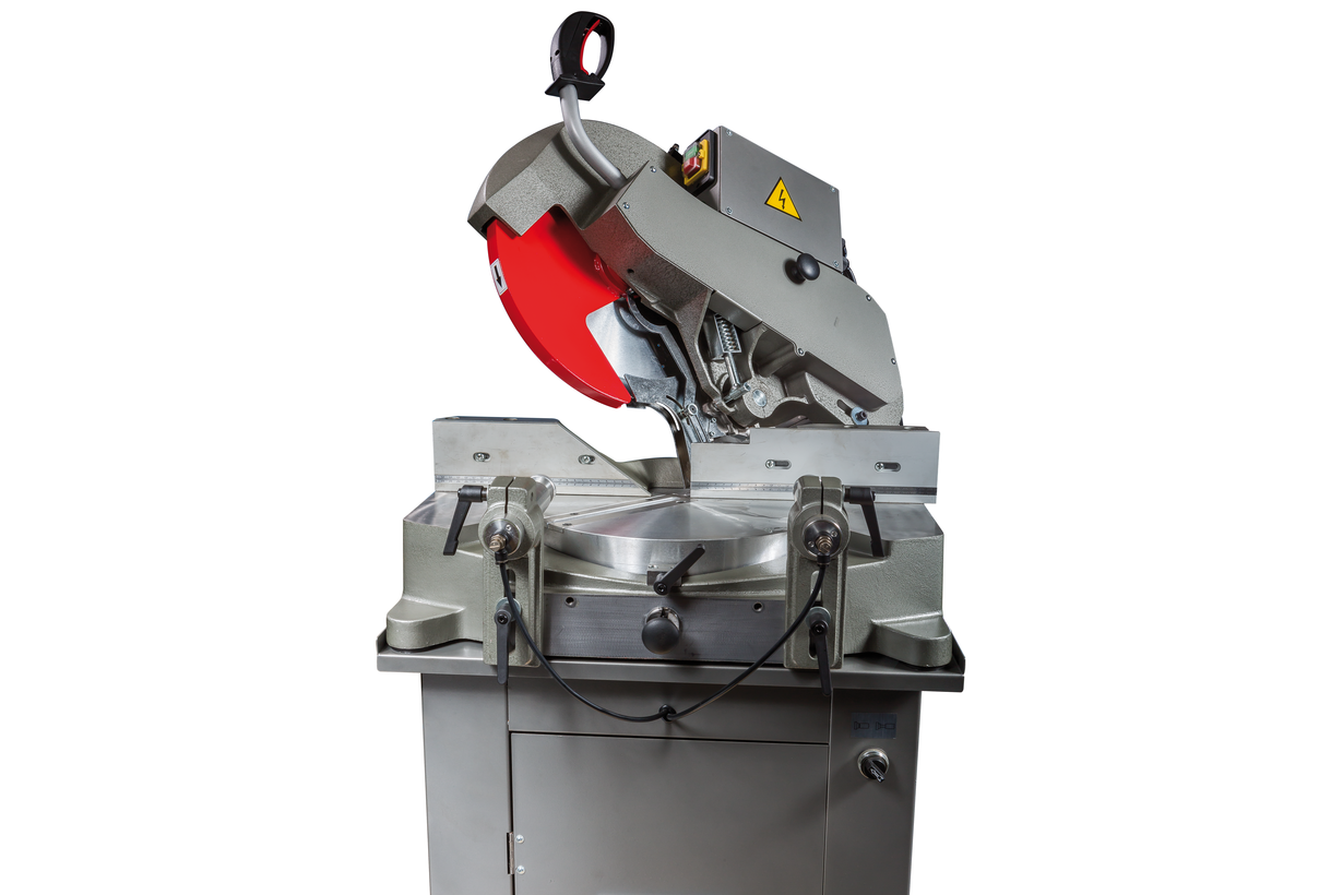 Модель SY-350 оснащена мощным электродвигателем – 1,5 кВт, обеспечивающий вращение отрезного диска со скоростью 2800 об/мин. Управление двигателем осуществляется с панели управления. Станок оборудован системой капельной подачи СОЖ непосредственно на отрезной диск. Конструкция имеет алюминиевый стол, на вертикальном прижиме имеется линейка, позволяющая выполнять необходимую кройку профилей. Вес станка вместе с подставкой, в снаряженном состоянии составляет 90 кг.