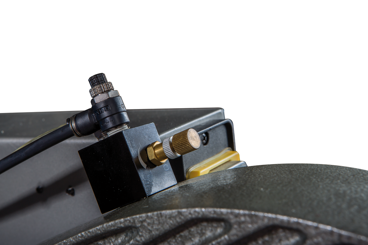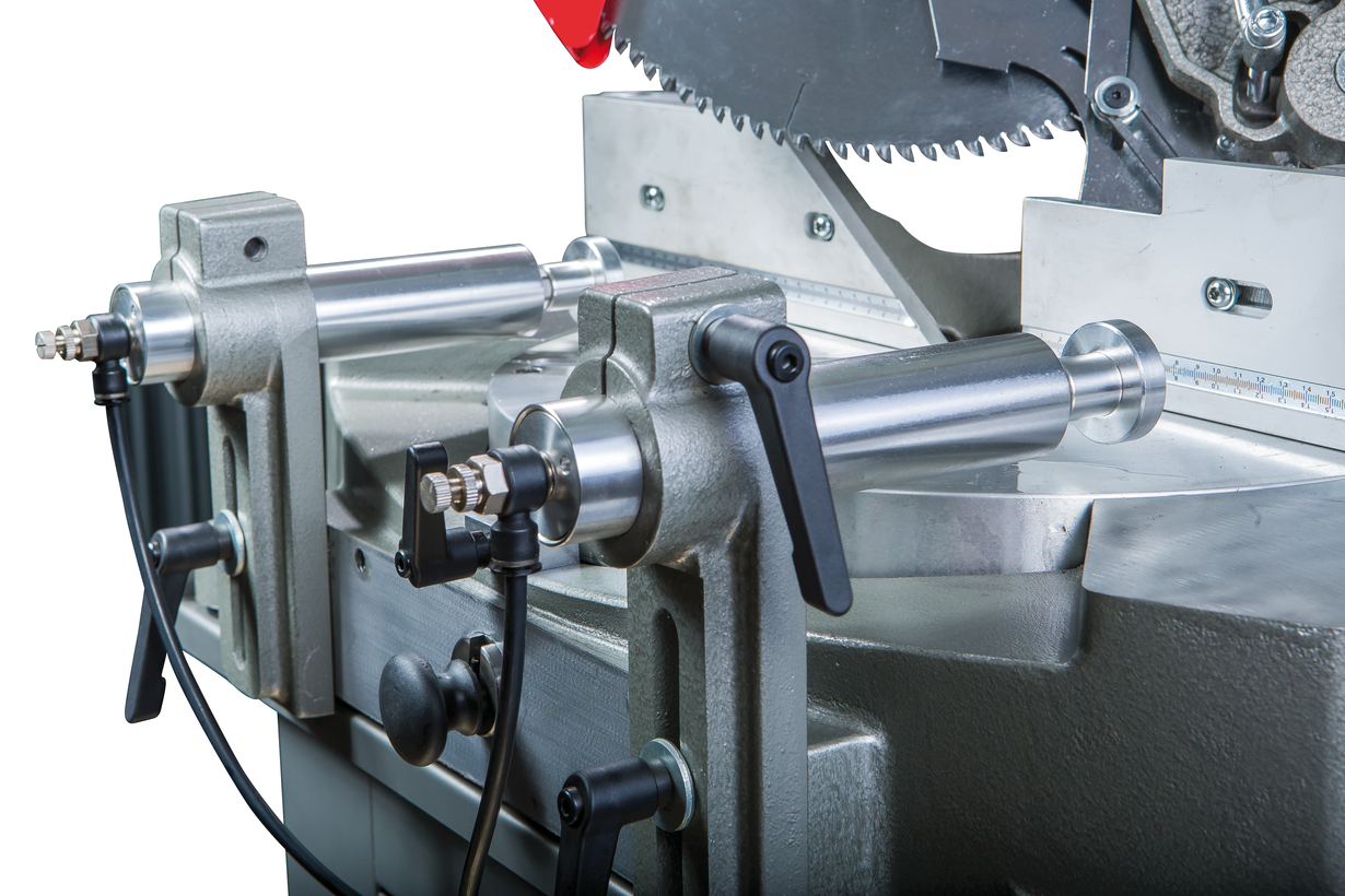 Дисковый отрезной станок оборудован системой пневматического привода основных узлов. Перед началом работы необходимо подключить станок к воздушной магистрали или обеспечить подачу воздуха работающим компрессором. Система пневматики обеспечивает работу прижимного механизма, фиксирующего заготовку в необходимом положении, повышая качество обработки и производительность. Прижимы имеют конструкцию, позволяющую выполнять настройку по высоте и вылету, надежно фиксируя алюминиевые профили с большой площадью сечения.