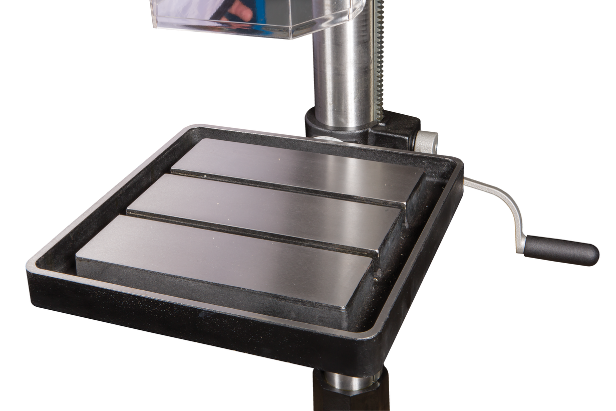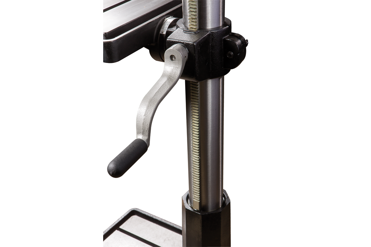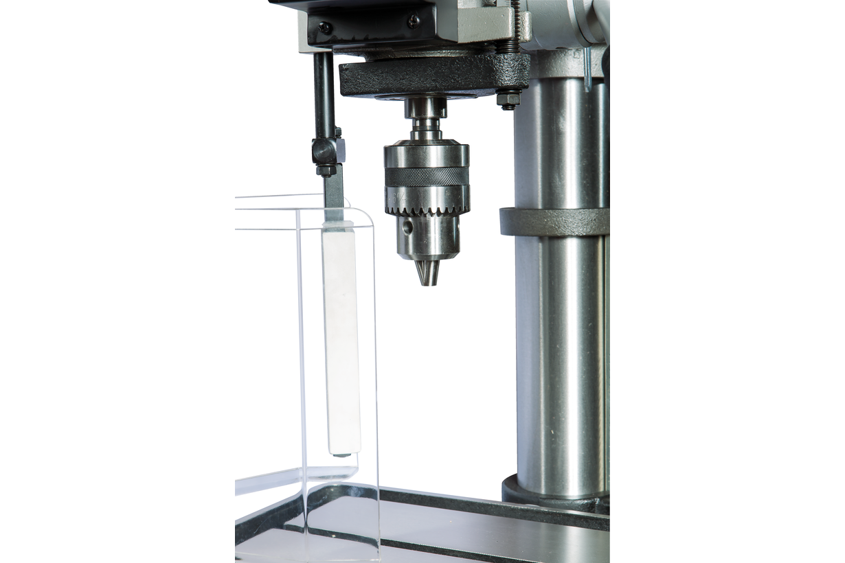 Максимальный диаметр сверления стали у данной модели составляет 16 мм (20 мм для чугуна). Также на станок можно установить торцевую или концевую фрезы диаметром 85 и 16 мм соответственно. Расстояние шпиндель-стол - 775 мм. Диаметр пиноли у IDP-17 составляет 52 мм, ее ход 118 мм. Размер поворотного рабочего стола - 355 х 355 мм, максимальная нагрузка – 50 кг. Поскольку станок промышленный, он требует подключения к трехфазной сети 480 В.