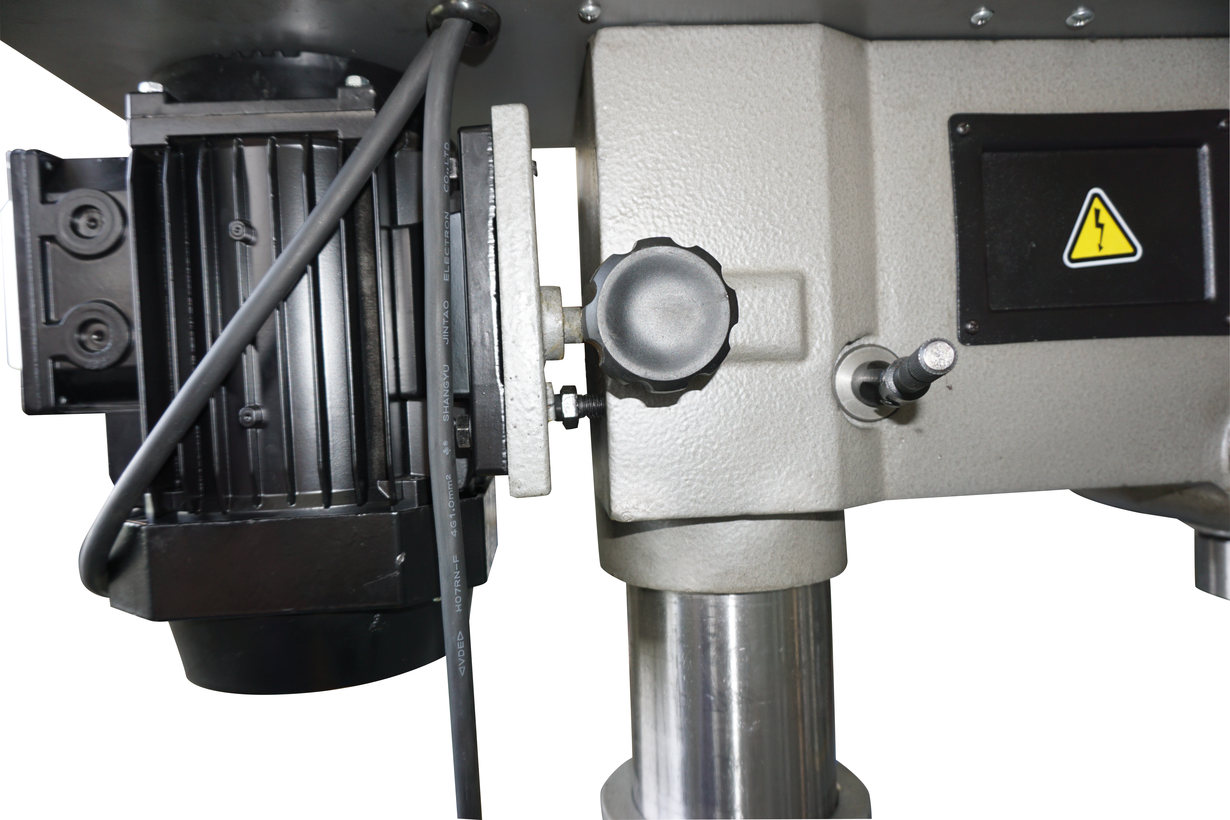 Индустриальный вертикальный сверлильный станок по металлу способный нарезать резьбу в стали, в режиме постоянных нагрузок, до М14. Станок оснащен мощным асинхронным двигателем в 750 Вт и подключается к сети 380 В. Станок предназначен и для сверления как заготовок небольшого размера, которые размещаются на столе, отлитый из серого чугуна, так и заготовок высоких, которые можно закрепить на основании, как же изготовленном из серого чугуна. Максимальное расстояние от шпинделя до основания составляет 1 метр 10 см (1100 мм). На основании предусмотрены два т-образных паза, которые надежно закрепят заготовку или оснастку.