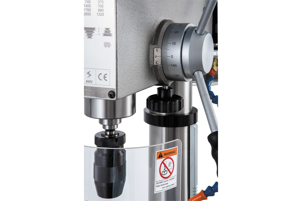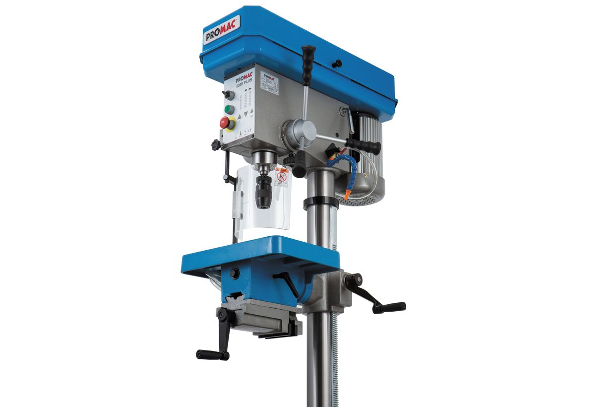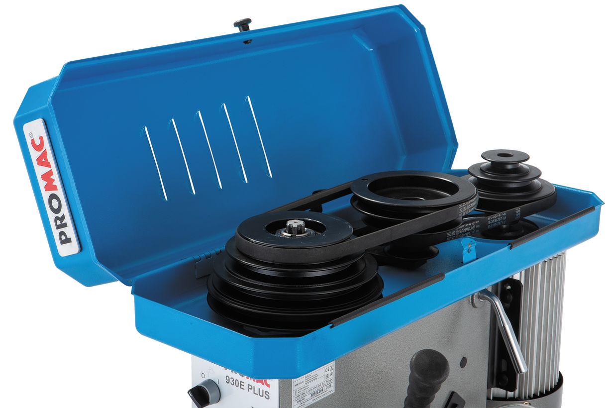 Станок выпускается на Тайване, что гарантирует его высокое качество и повышенную надежность. PROMAC 930E PLUS может сверлить стальные заготовки диаметром сверла до 30 мм с частотой вращения шпинделя от 105 до 2650 об/мин. Всего предусмотрено 18 фиксированных скоростей выполненных в виде клиноременной передачи на выбранной паре шкивов.