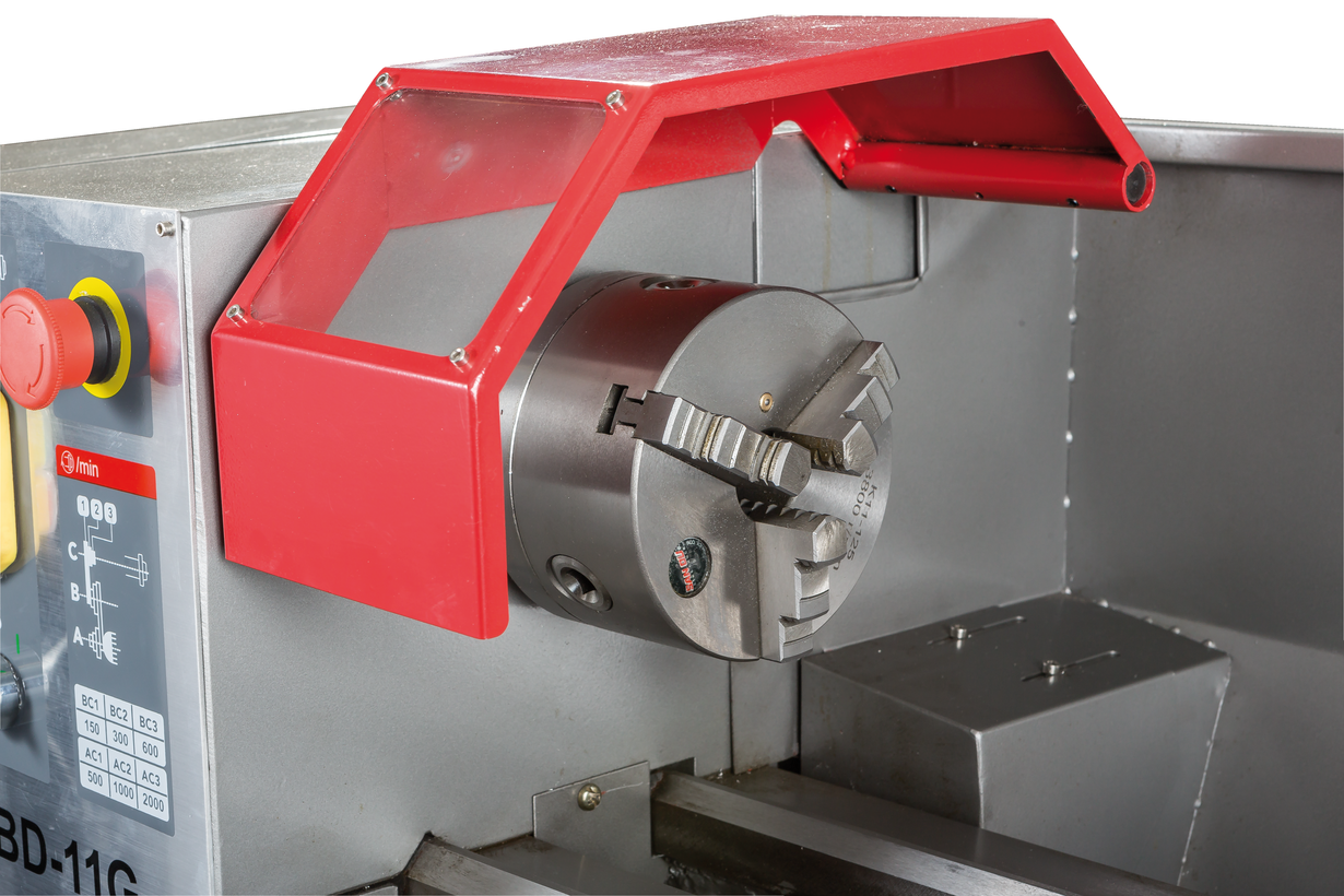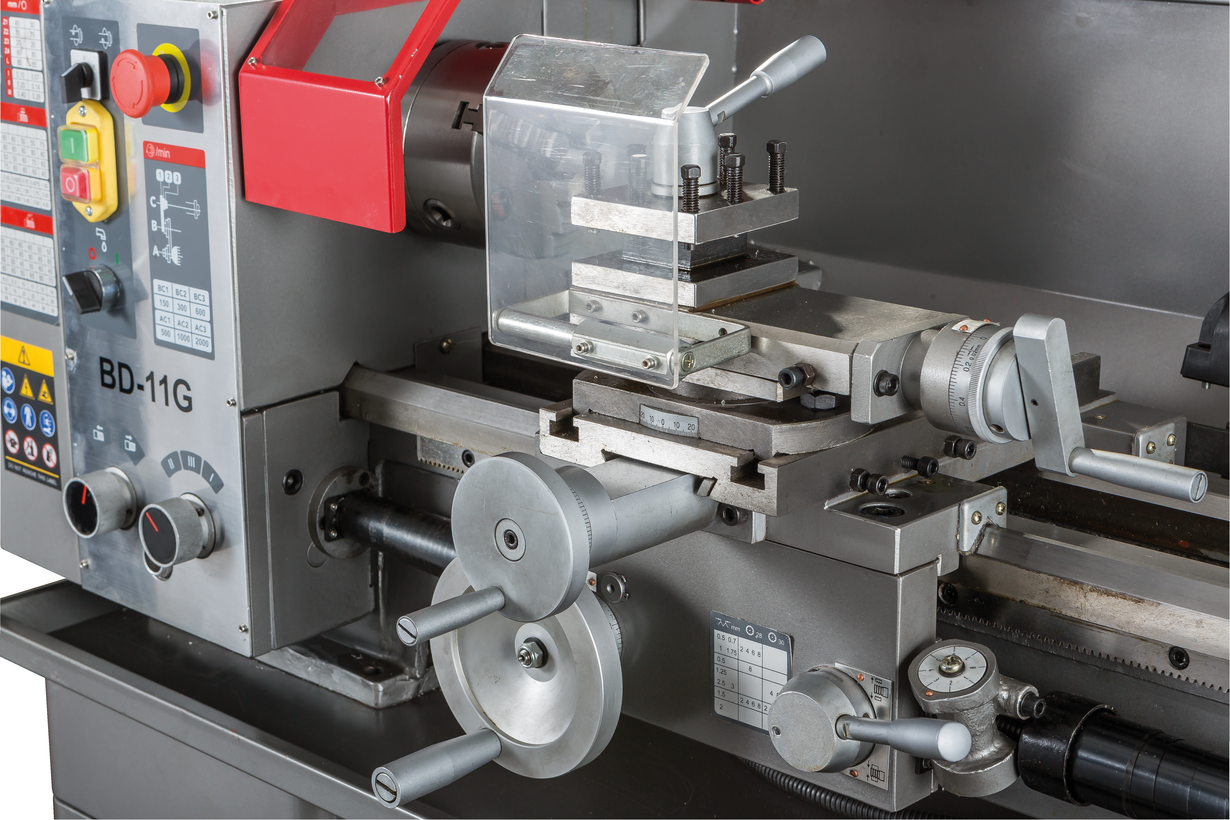 Настольный токарный станок от JET BD-11G поставляется на тумбе и имеет самый мощный двигатель в линейке настольных токарных станков от JET 1,1 кВт. Двигатель асинхронный, подключается к обычной бытовой сети и имеет потребляемую мощность 1,5 кВт. Благодаря асинхронному двигателю на станке отсутствует потеря момента, а скорости вращения шпинделя изменяются путем перебрасывания ремня на шкивах. Всего скоростей шесть в диапазоне от 150 оборотов в минуту до 2000 об/мин. Расстояние между центрами 700 мм, максимальный диаметр над станиной 280 мм. Станок BD-11G способен выполнять все операции токарного станка. На станке предусмотрена возможность нарезание правой и левой резьбы, автоматическая продольная подача суппорта, возможность поворота резцедержки для проточки малых конусов, юстировка задней бабки для проточки больших конусов. На станке установлена коробка подач, 3-х ступенчатая, которая позволяет изменять шаг резьбы или скорость автоматической подачи без замены шестеренок. Все шестерни, установленные на станке, выполнены из металла. Станок поставляется в комплекте с 3-х кулачковым патроном и неподвижным люнетом. Все остальное можно докупить по мере необходимости – это и 4-х кулачковый патрон, и подвижный люнет, и станцию СОЖ, планшайба, резцы и множество других аксессуаров.
